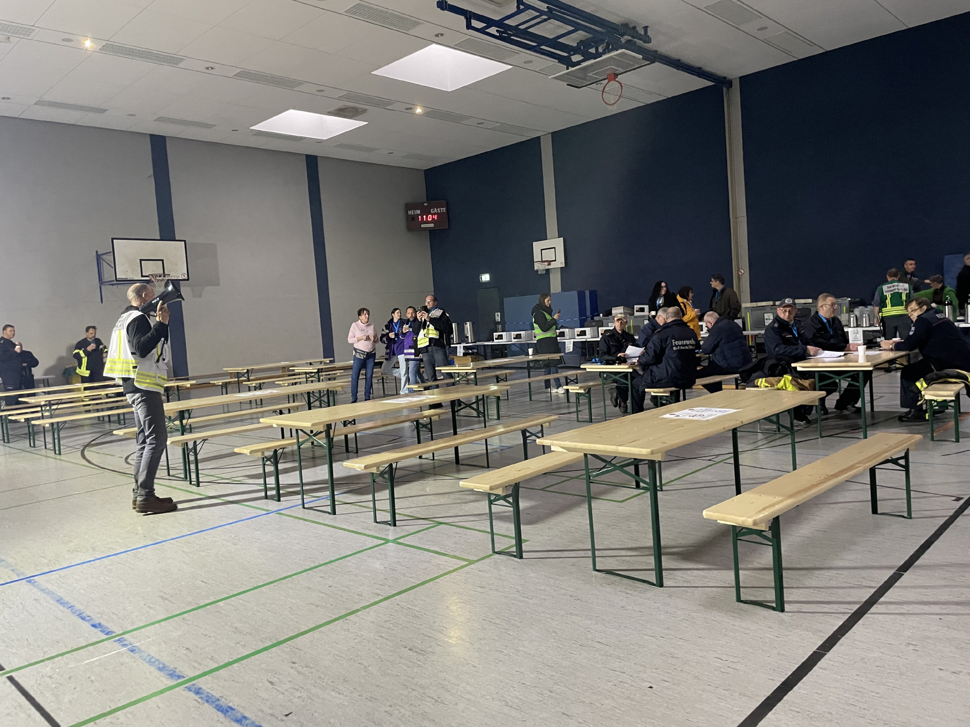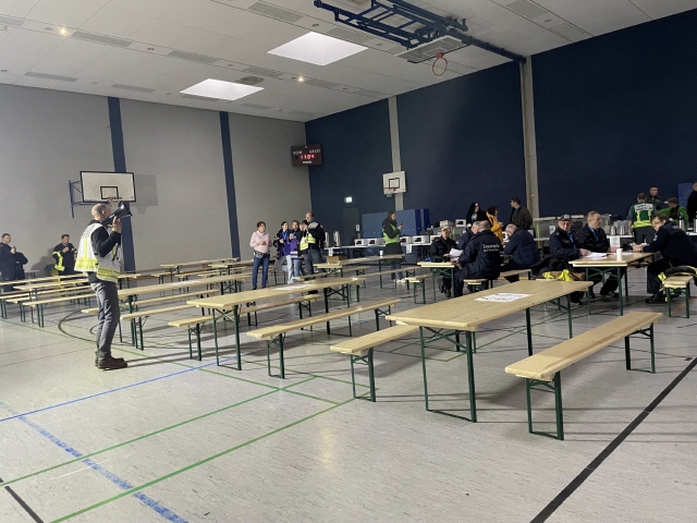 Am Hallentor tuckert das Notstromaggregat, im Inneren stellt das Personal Tische, Bänke, Lichtmast und Geräte auf. Wer für Strom, Wasser, Einlass, Erste Hilfe und Technik zuständig ist, wird vorher festgelegt. Für das Team ist es nach der Gründung die erste testweise Inbetriebnahme der Einrichtung. Wärmedecken, Klappstühle, Mikrowellen, Hinweisschilder – alles findet nach und nach seinen Platz vor und in der Halle. Währenddessen finden sich die ersten Beobachter vor der Tür ein, die zugleich verschiedenste Bedürfnisse in der Notlage simulieren werden.