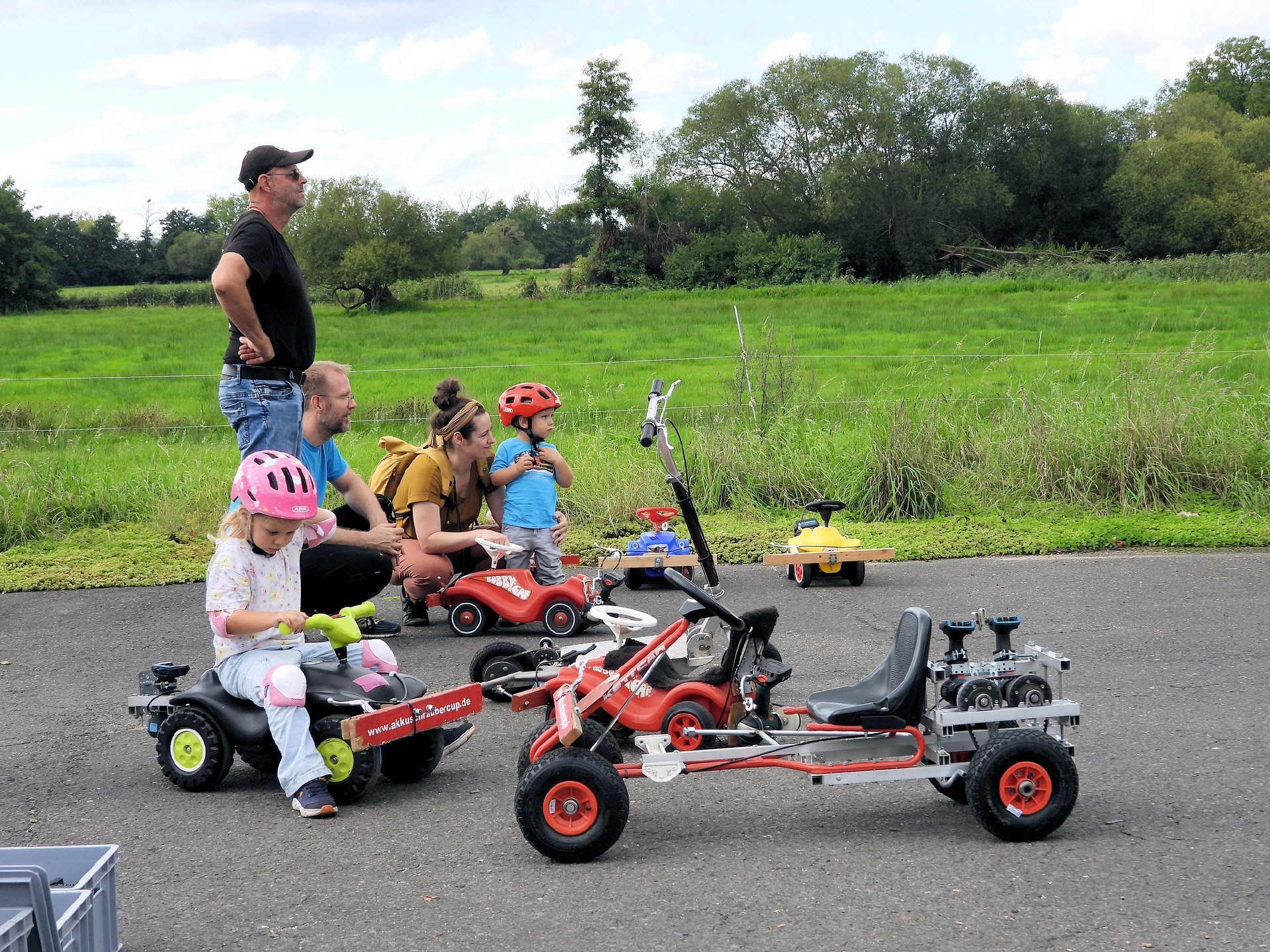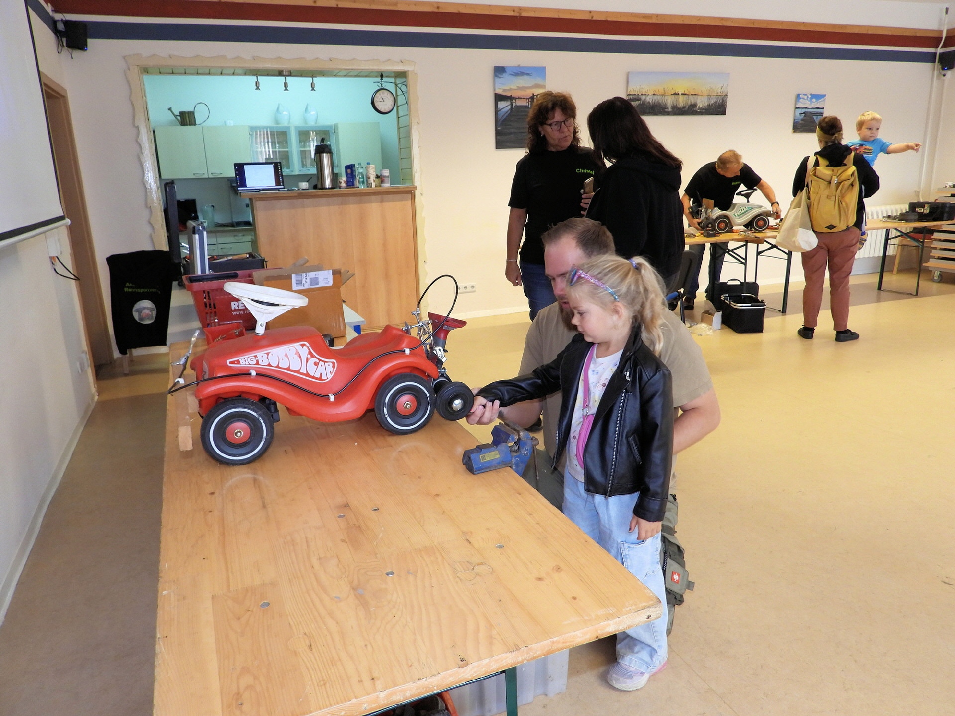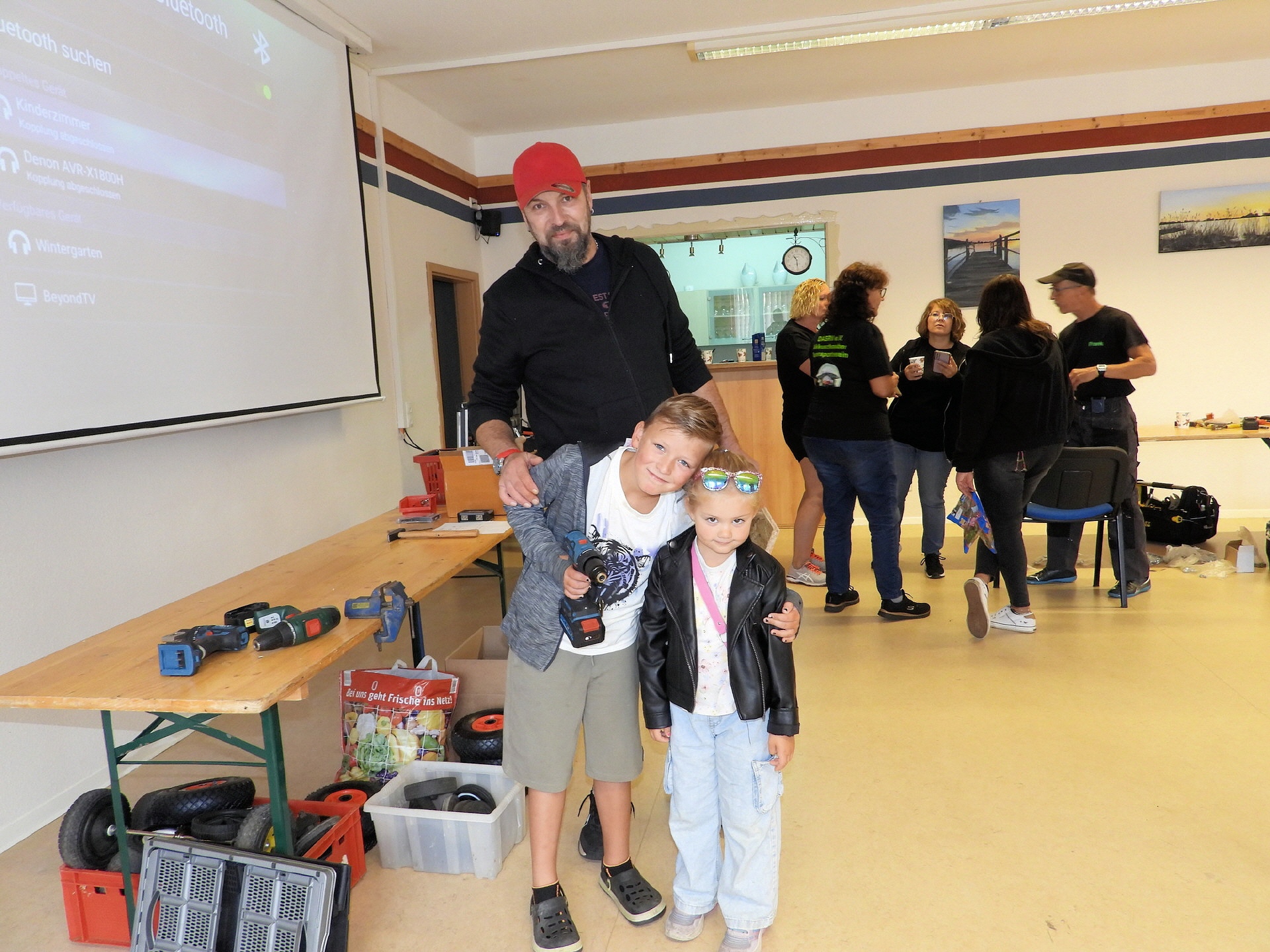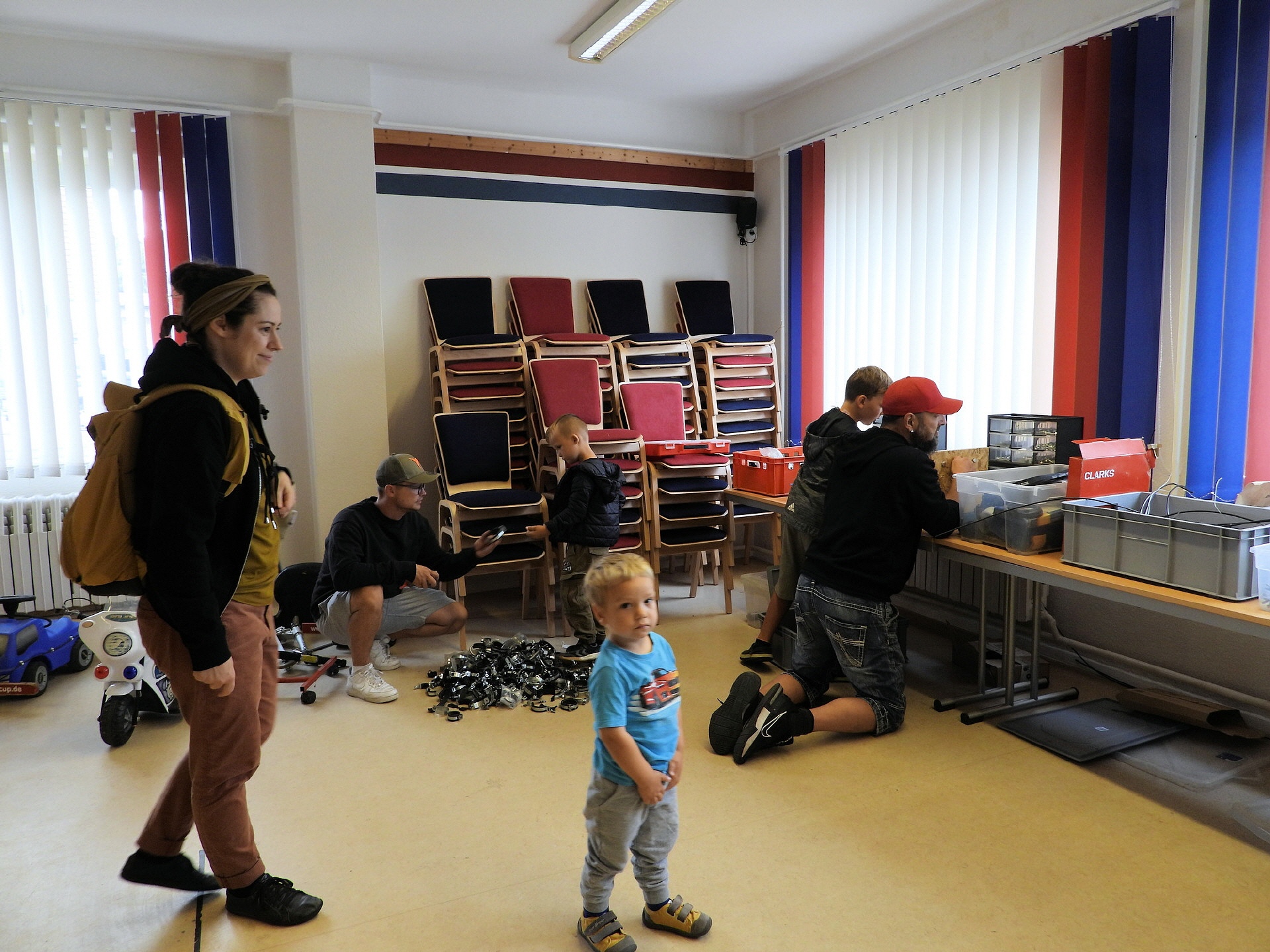 Neben den Mitgliedern und Aktiven waren auch einige Gäste anwesend, darunter junge Familien mit Kindern, die zuschauen, mitbasteln und letztendlich die reparierten, neu aufgebauten und instandgesetzten Fahrzeuge testen konnten. Den Kindern hat es großen Spaß gemacht, mit Mama, Papa oder auch Oma und Opa zu basteln und anschließend auf der Rennstrecke, dem Parkplatz in der Straße zur Fähre, die Reifen qualmen zu lassen.