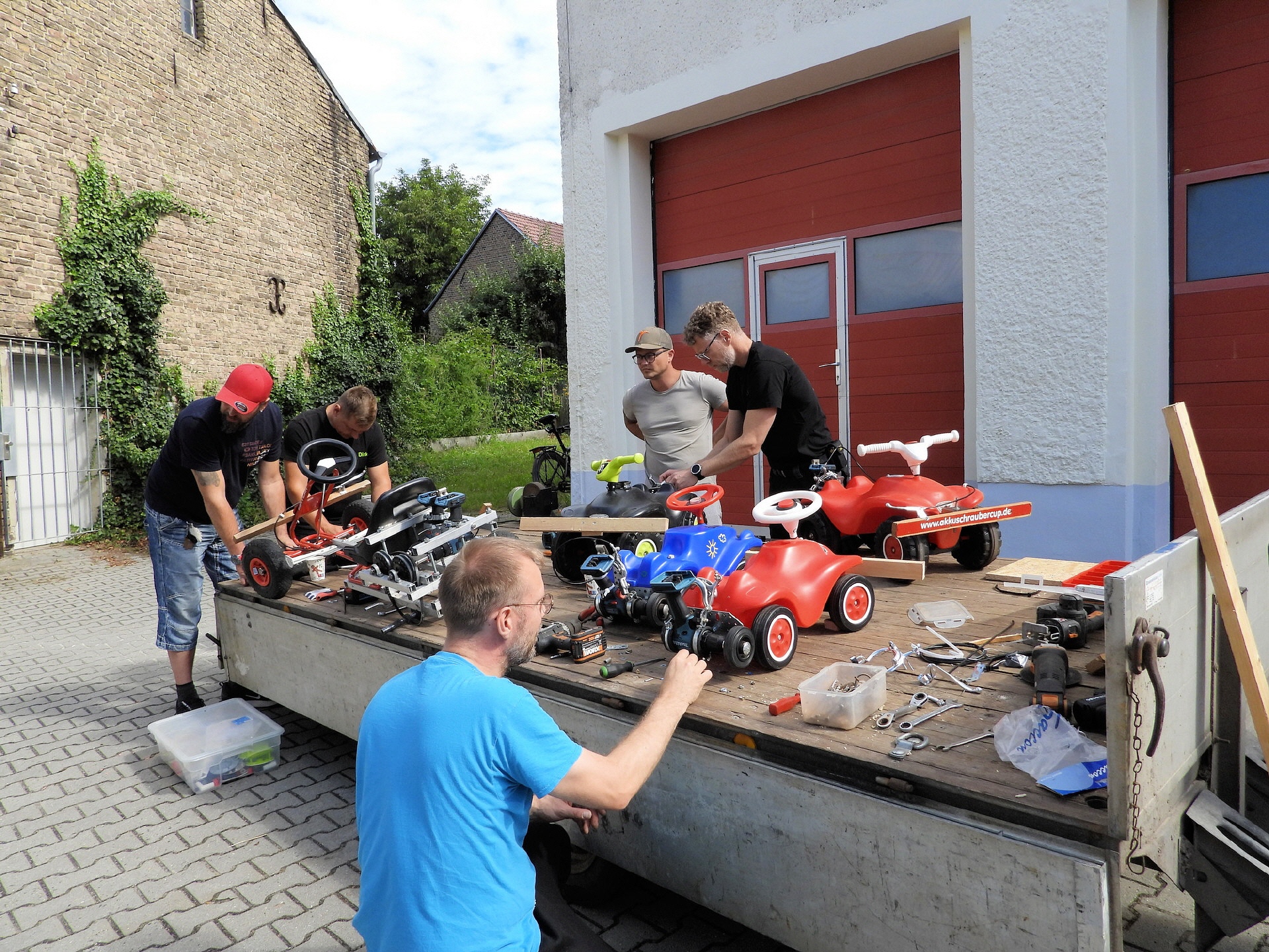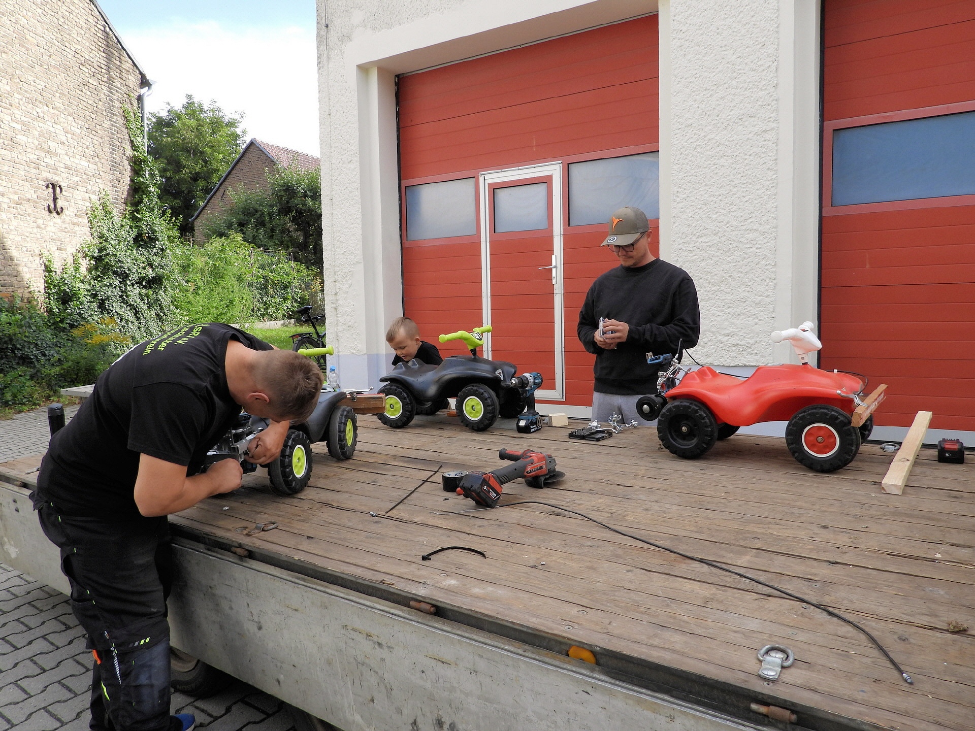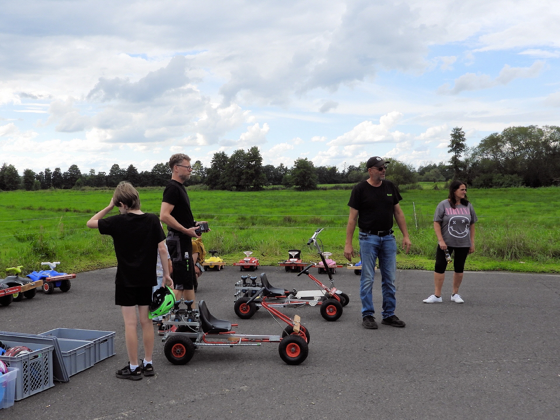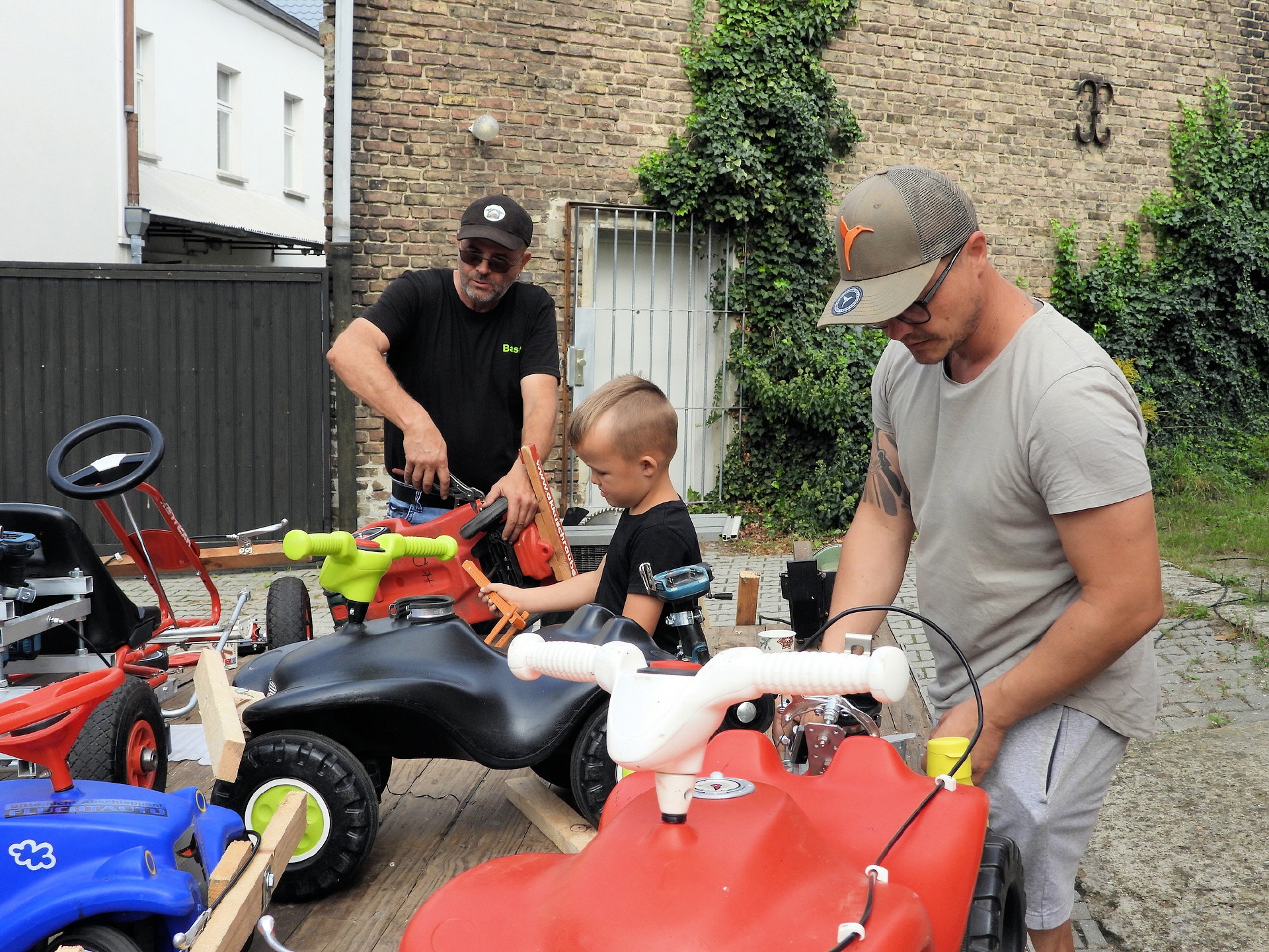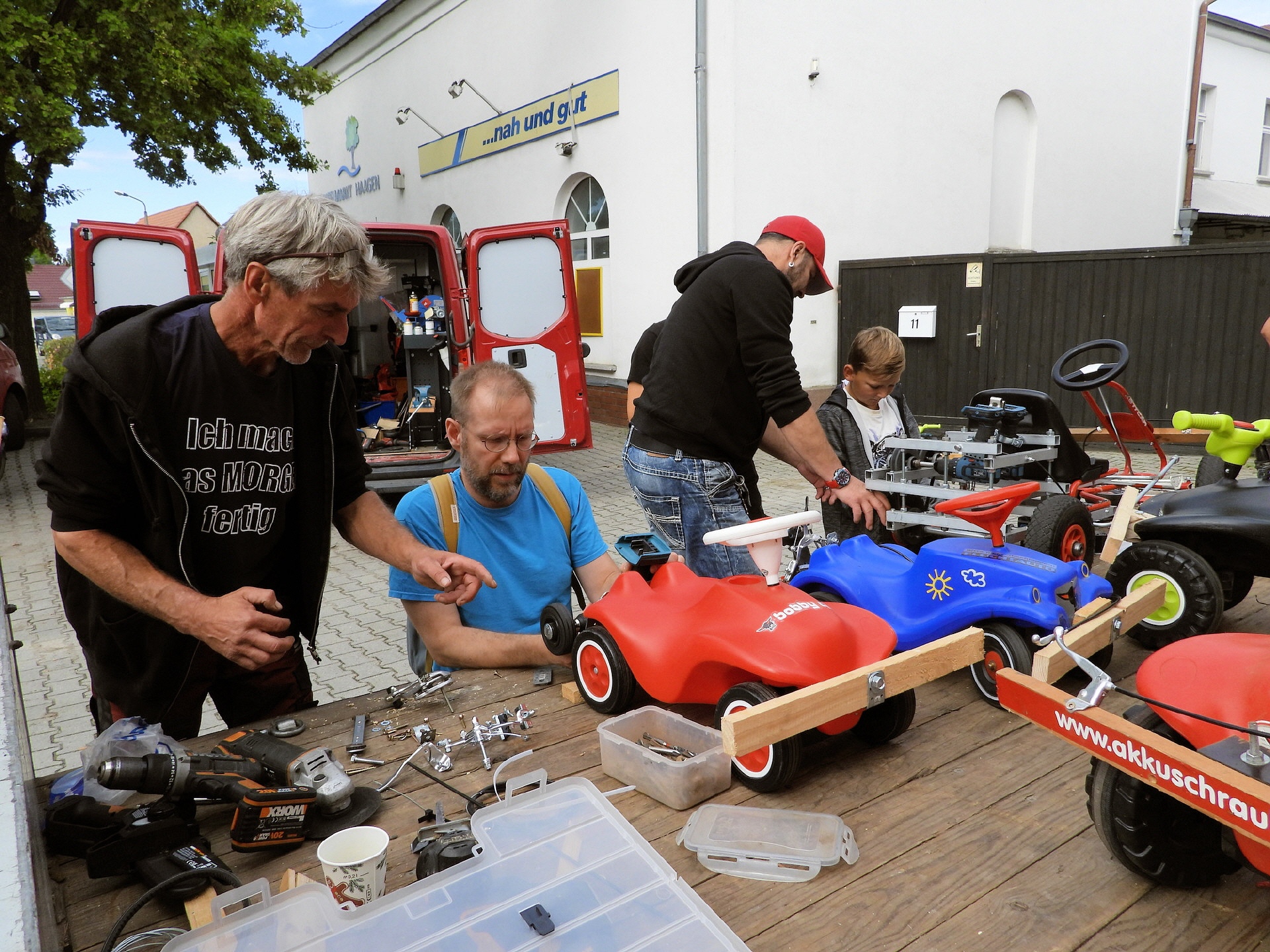 Neben den Mitgliedern und Aktiven waren auch einige Gäste anwesend, darunter junge Familien mit Kindern, die zuschauen, mitbasteln und letztendlich die reparierten, neu aufgebauten und instandgesetzten Fahrzeuge testen konnten. Den Kindern hat es großen Spaß gemacht, mit Mama, Papa oder auch Oma und Opa zu basteln und anschließend auf der Rennstrecke, dem Parkplatz in der Straße zur Fähre, die Reifen qualmen zu lassen.
