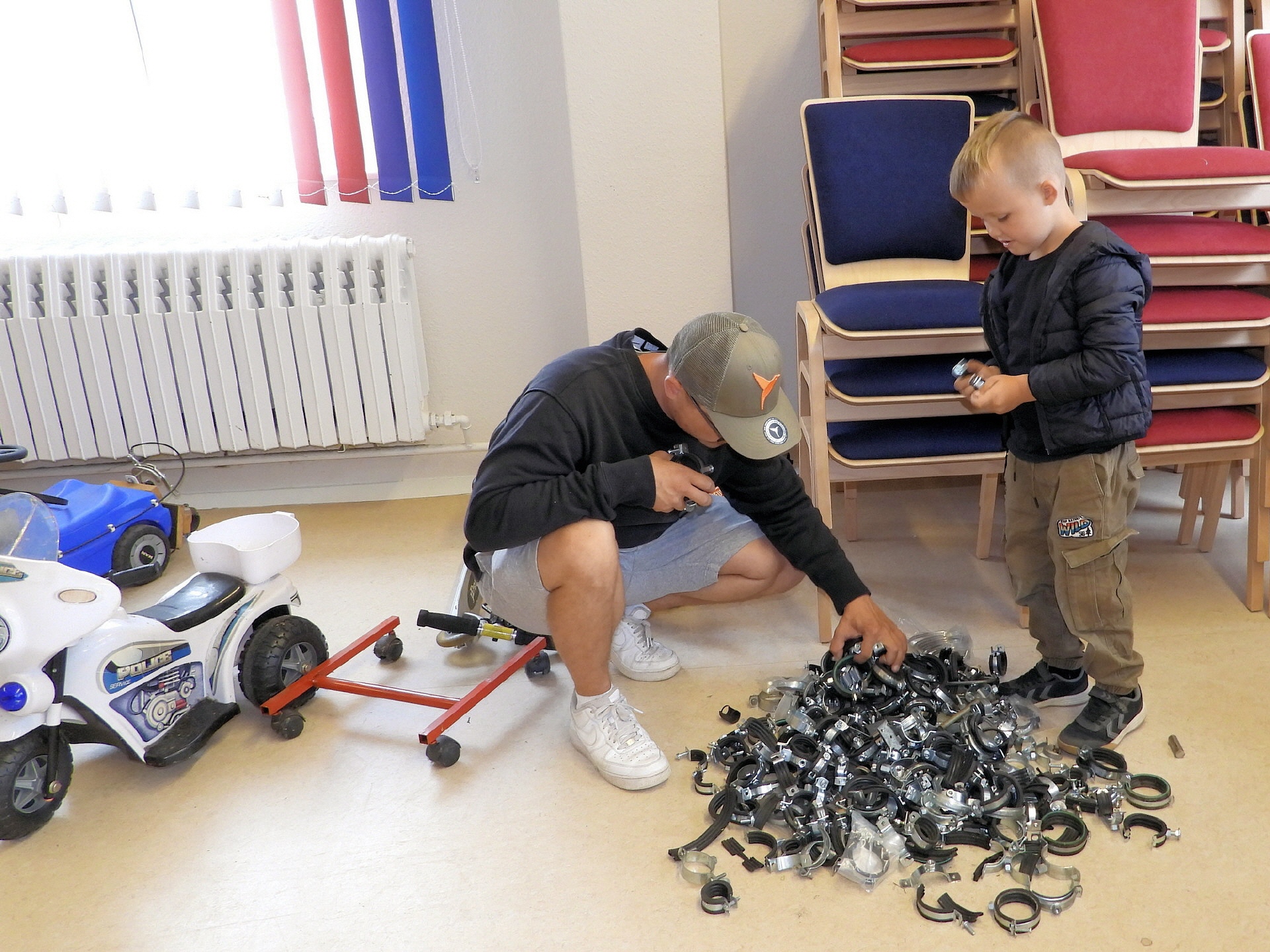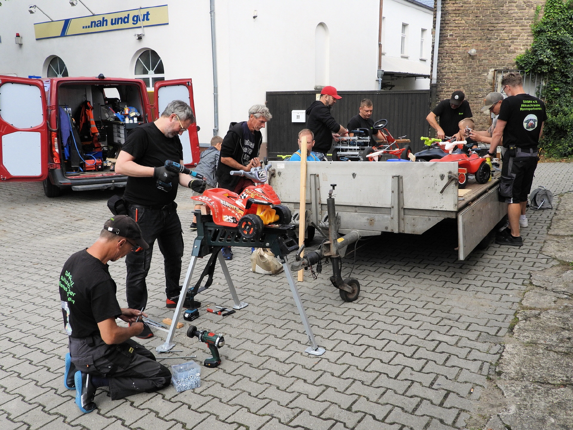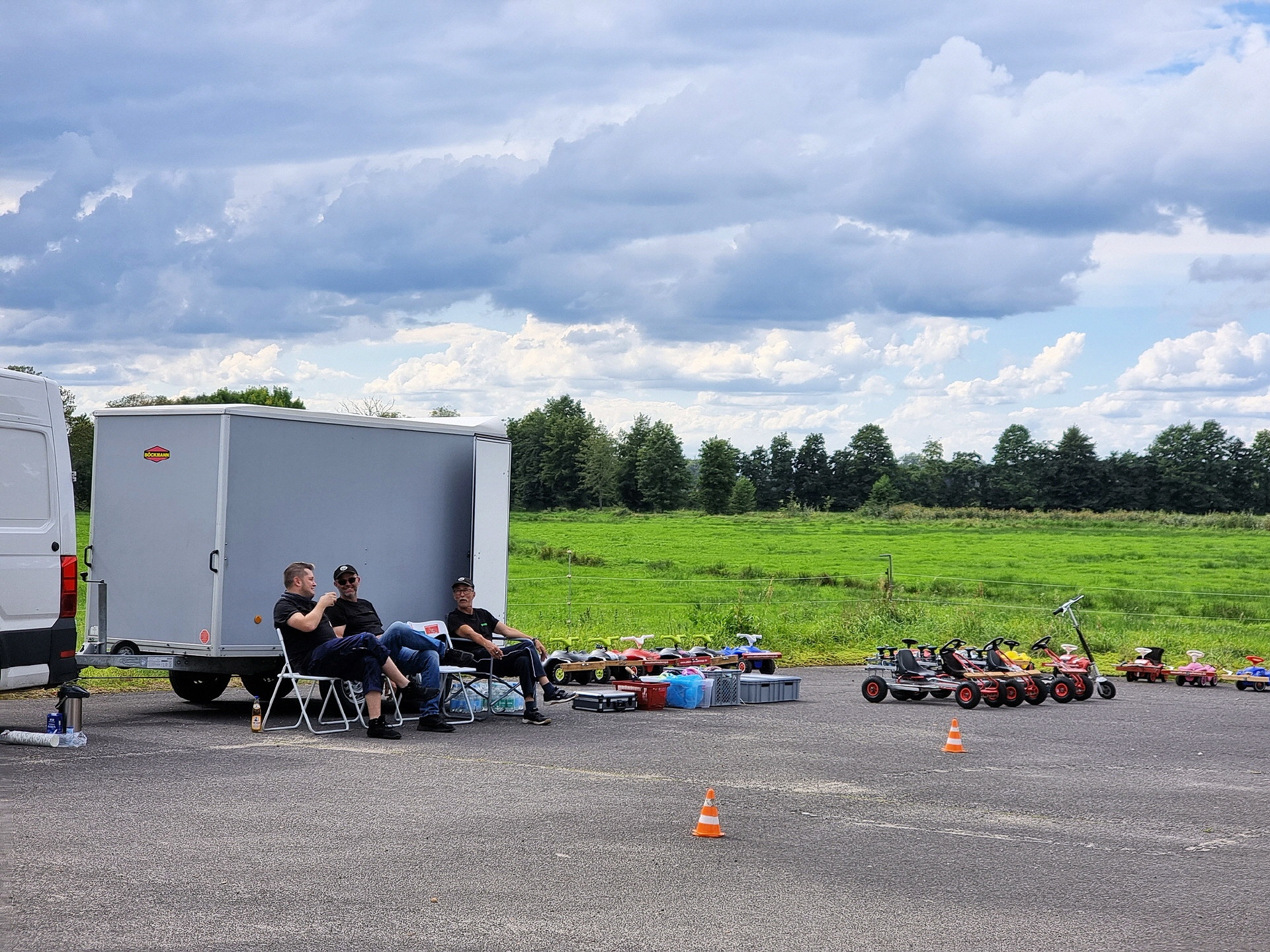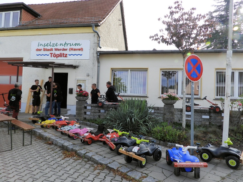 Neben den Mitgliedern und Aktiven waren auch einige Gäste anwesend, darunter junge Familien mit Kindern, die zuschauen, mitbasteln und letztendlich die reparierten, neu aufgebauten und instandgesetzten Fahrzeuge testen konnten. Den Kindern hat es großen Spaß gemacht, mit Mama, Papa oder auch Oma und Opa zu basteln und anschließend auf der Rennstrecke, dem Parkplatz in der Straße zur Fähre, die Reifen qualmen zu lassen.