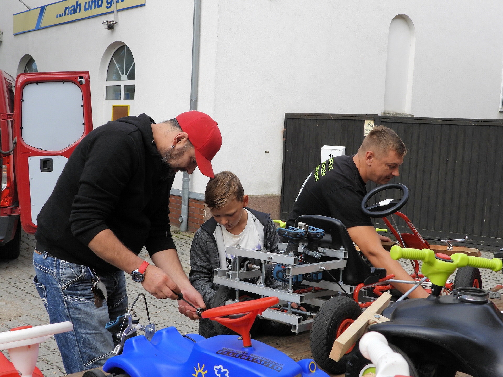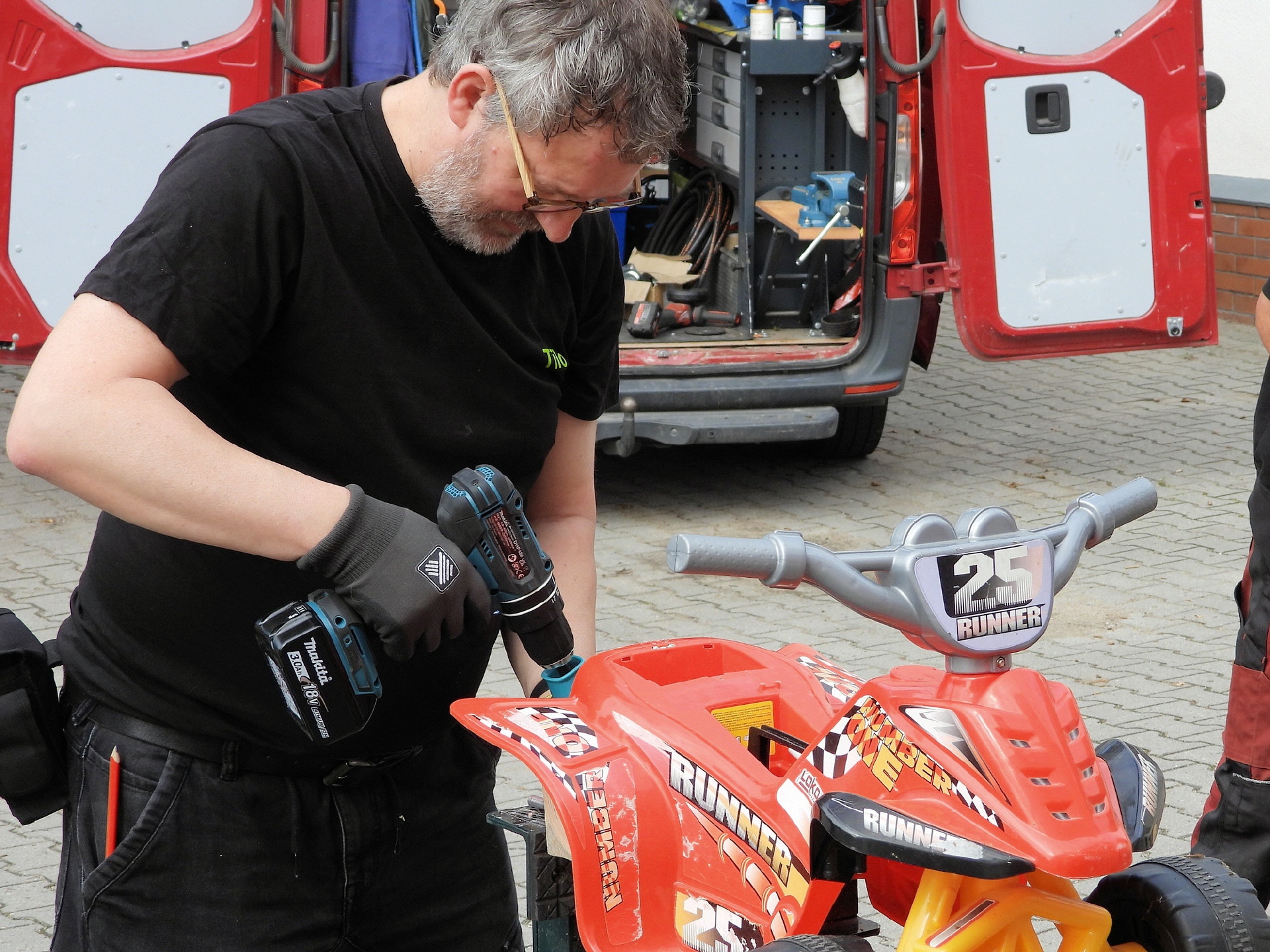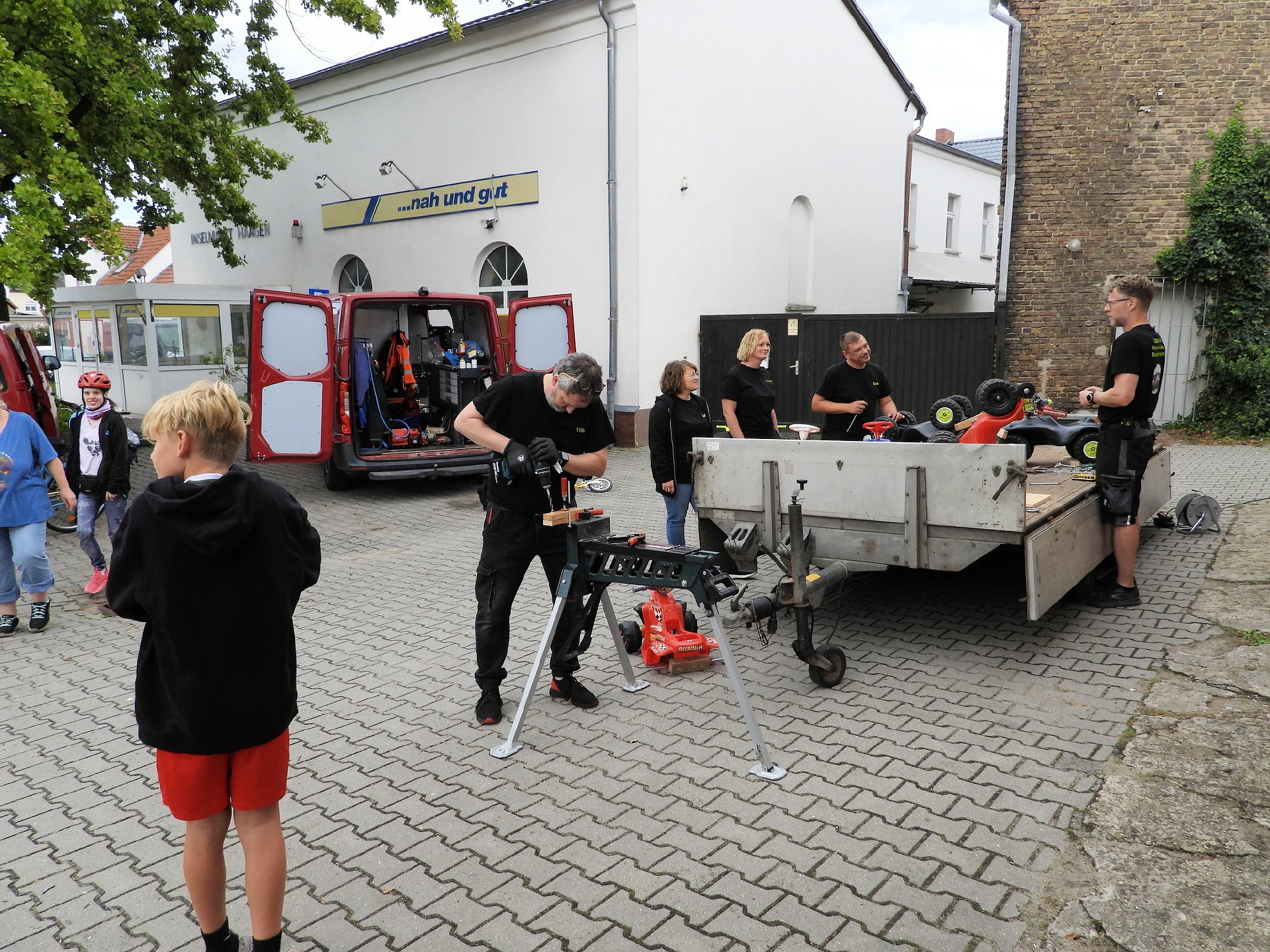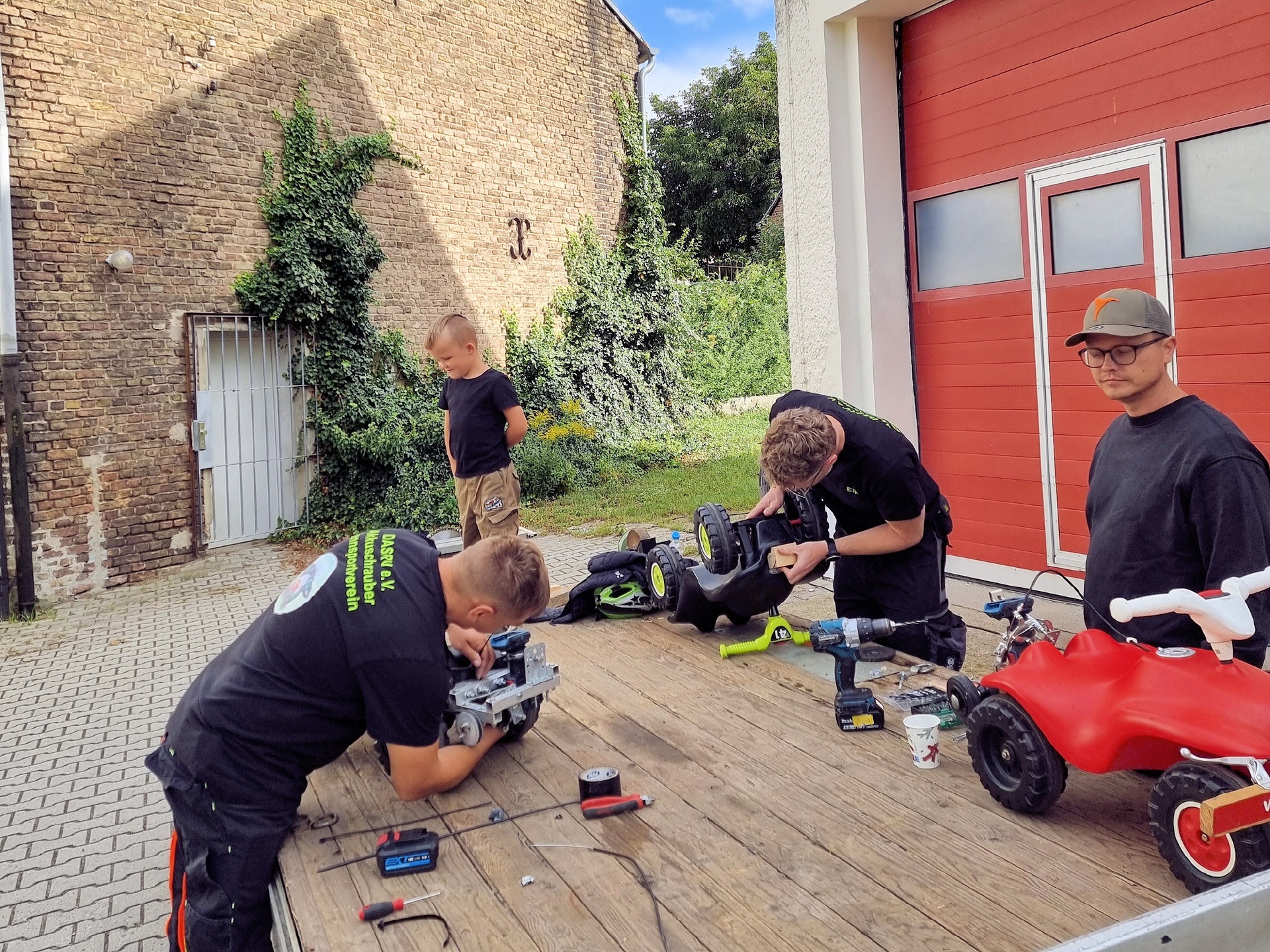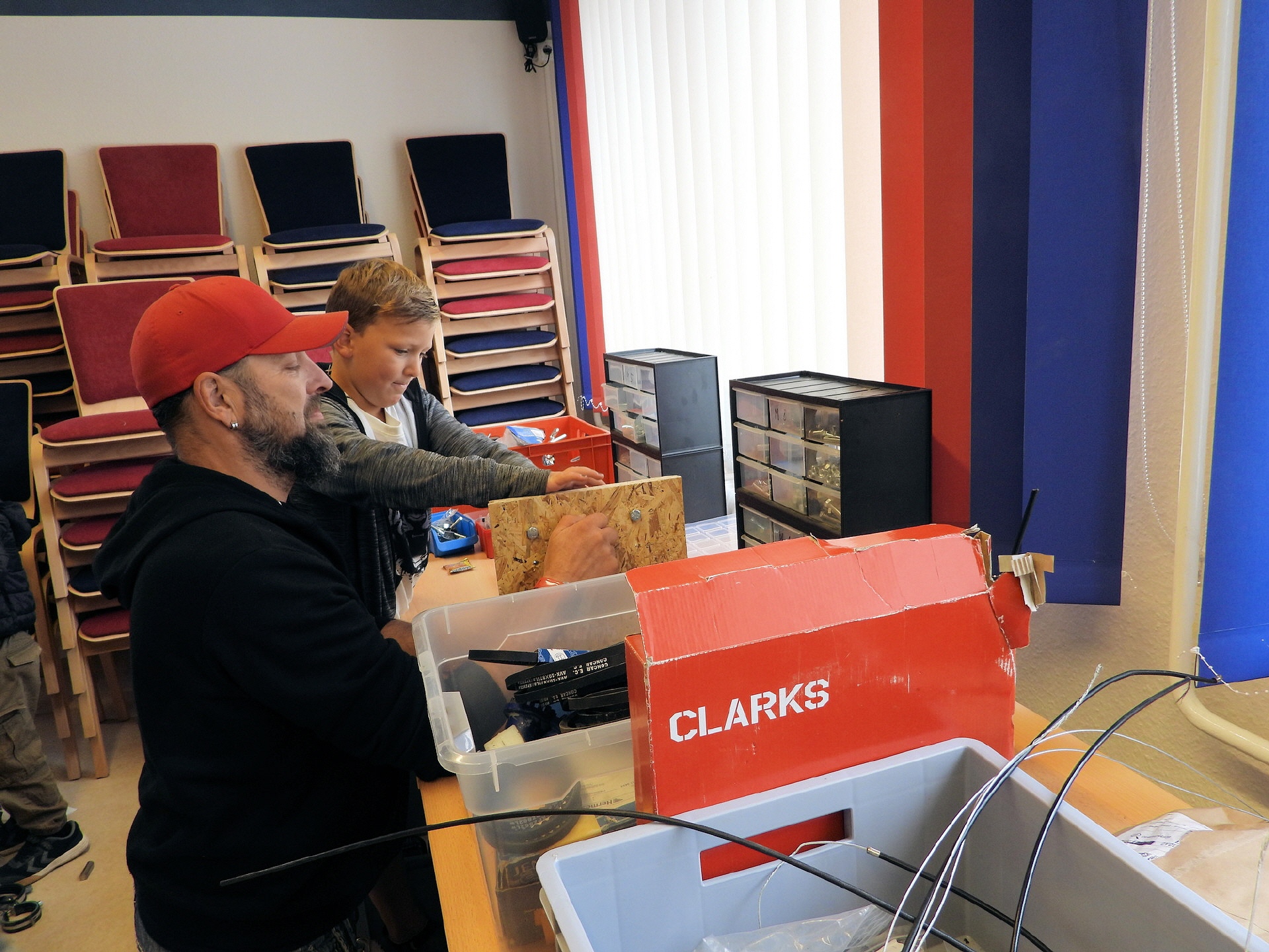 Neben den Mitgliedern und Aktiven waren auch einige Gäste anwesend, darunter junge Familien mit Kindern, die zuschauen, mitbasteln und letztendlich die reparierten, neu aufgebauten und instandgesetzten Fahrzeuge testen konnten. Den Kindern hat es großen Spaß gemacht, mit Mama, Papa oder auch Oma und Opa zu basteln und anschließend auf der Rennstrecke, dem Parkplatz in der Straße zur Fähre, die Reifen qualmen zu lassen.