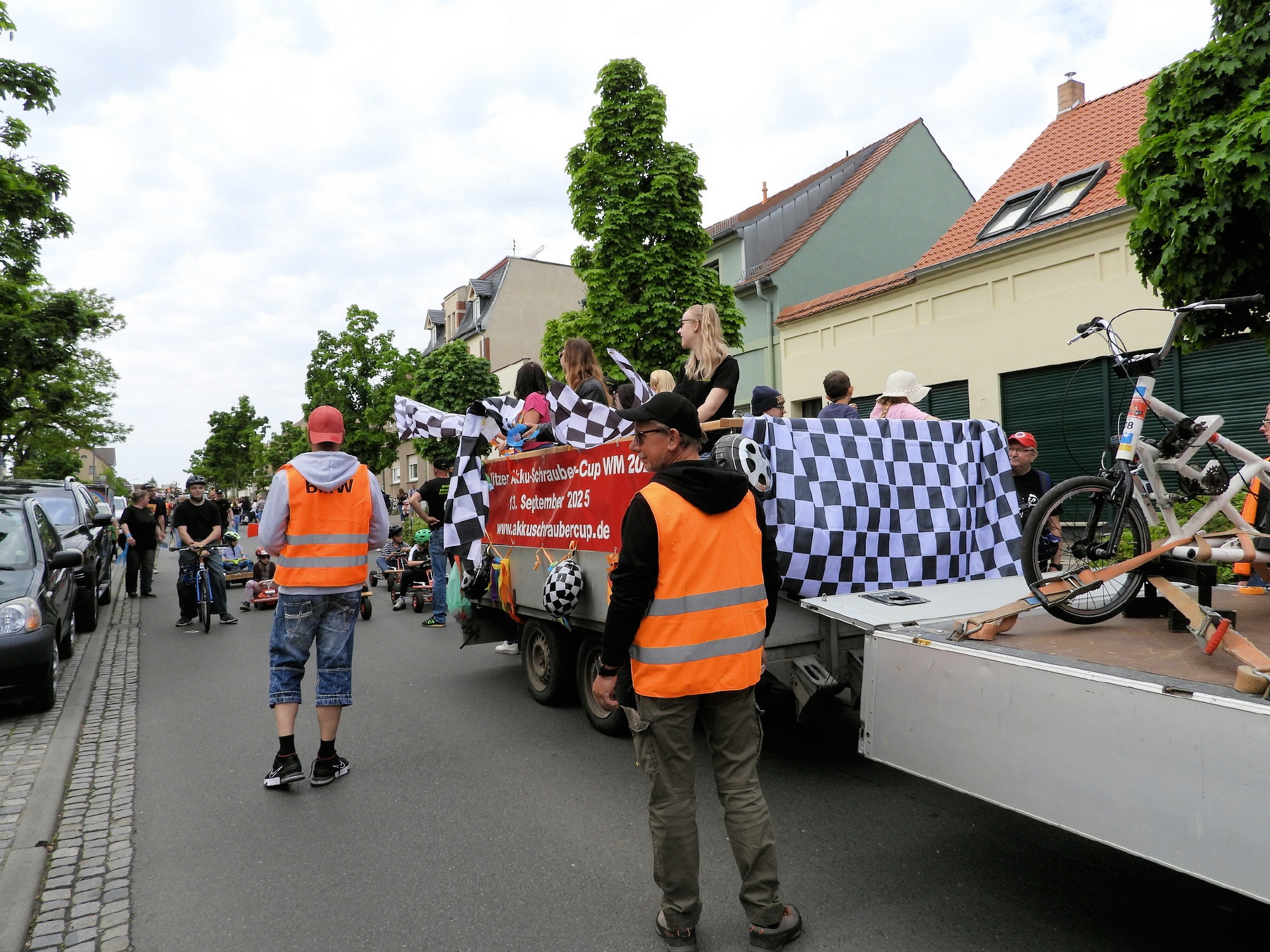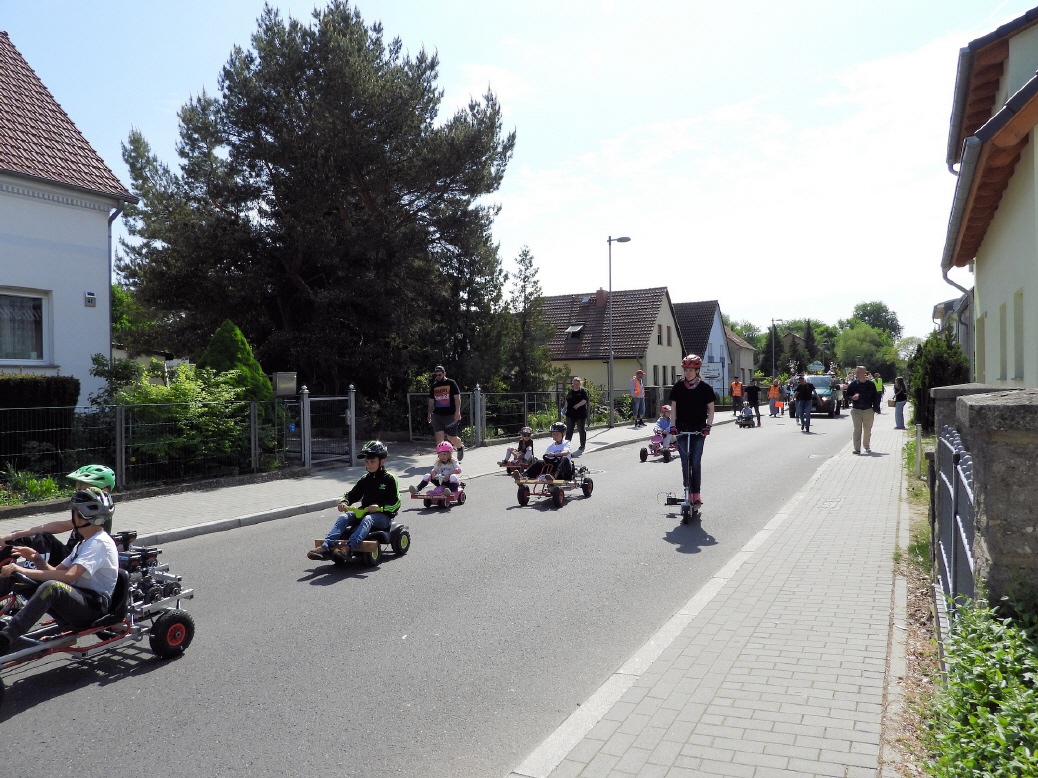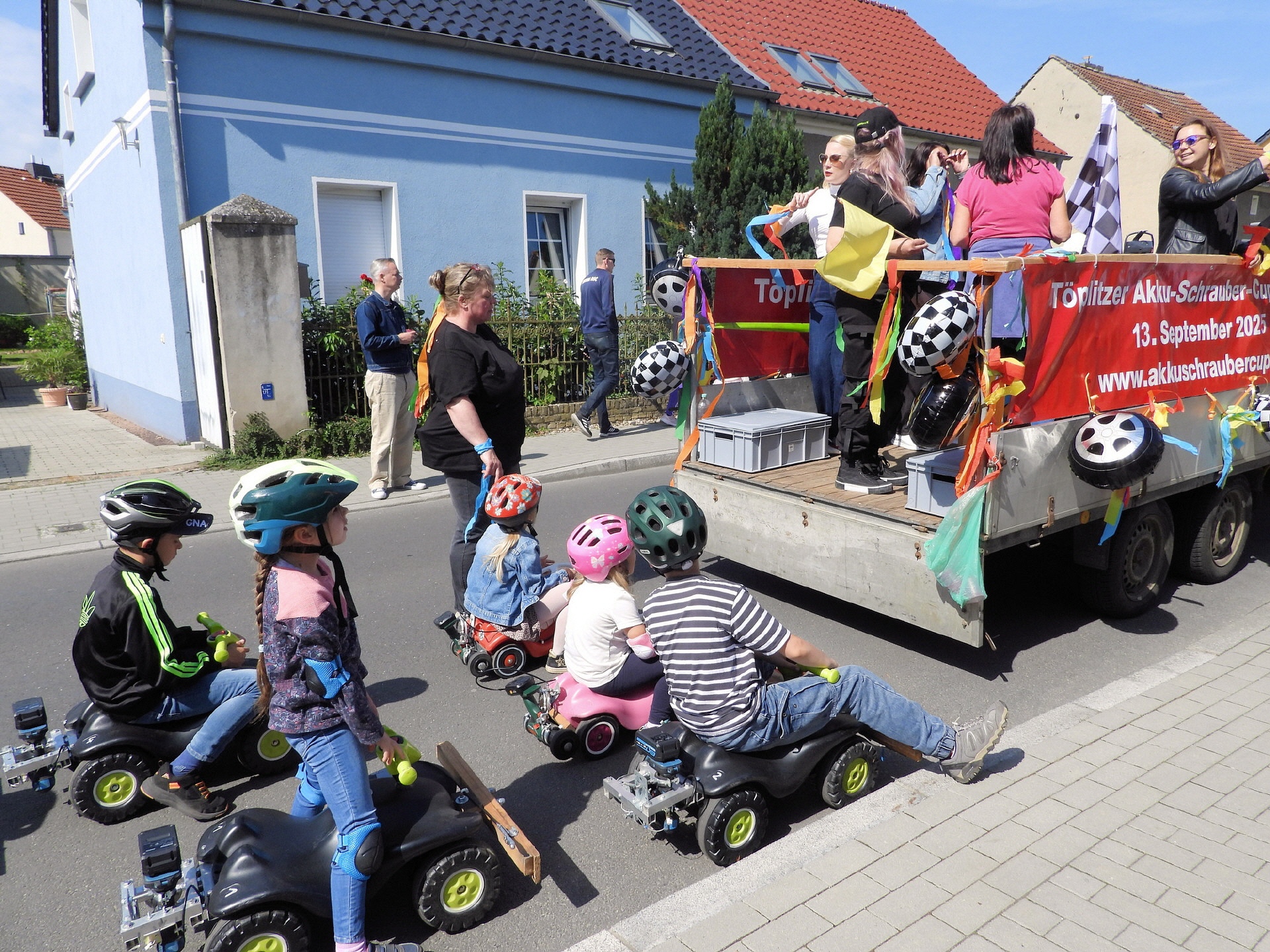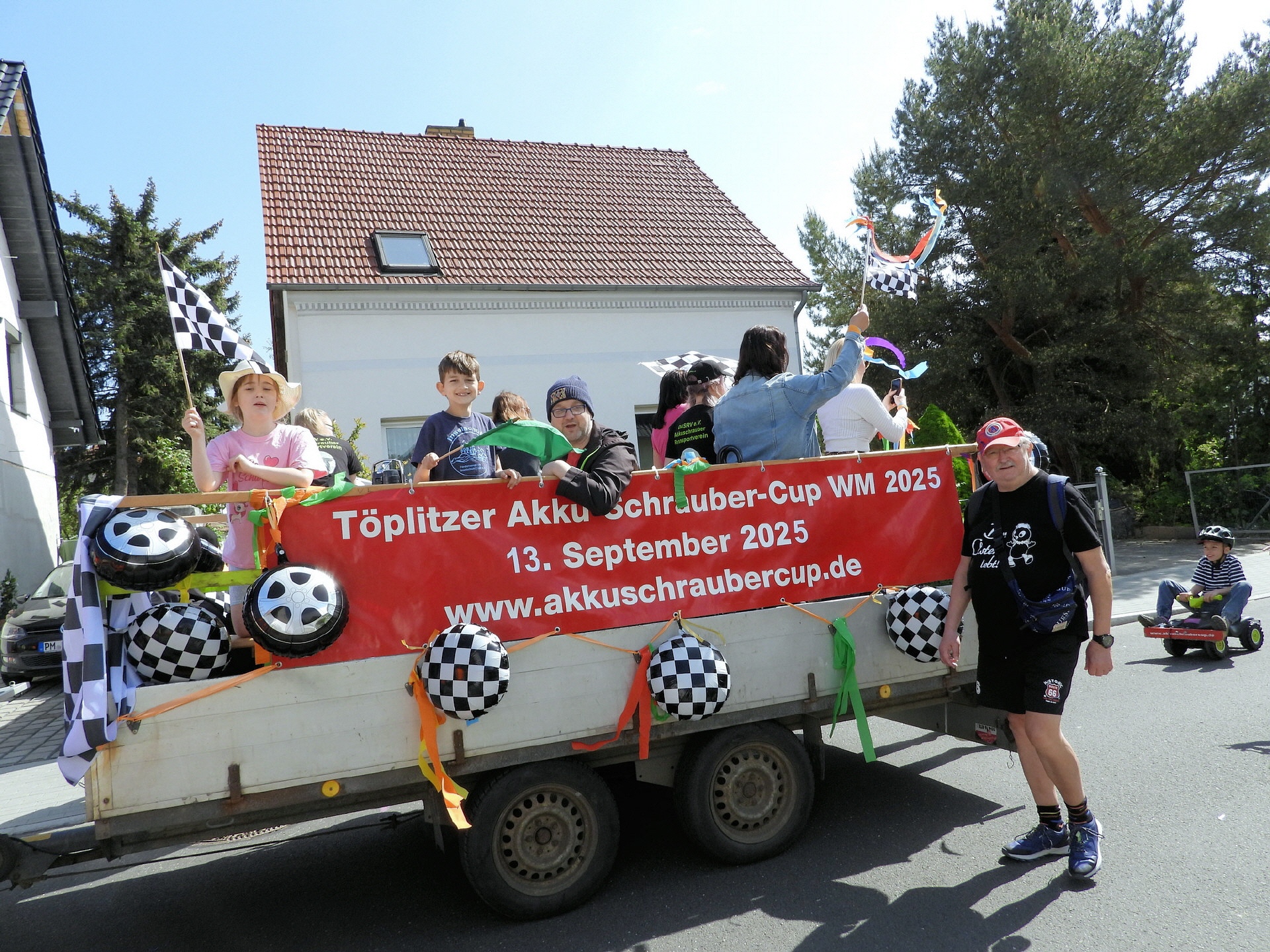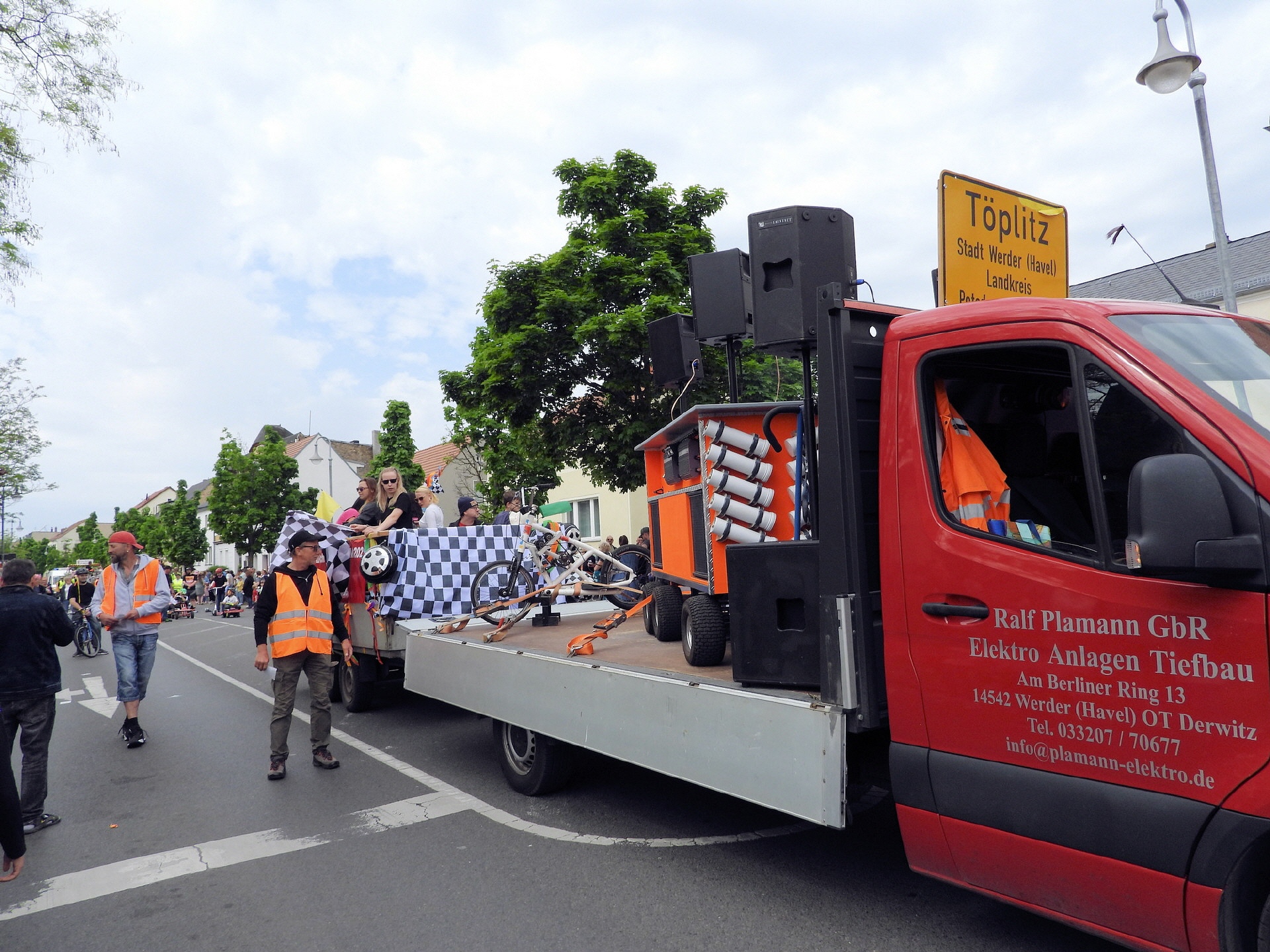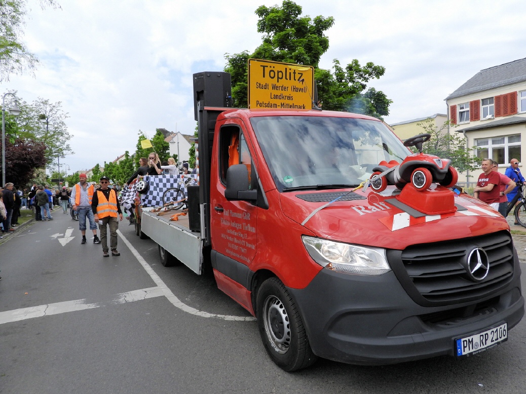 Angeführt wurde der Tross durch den "Töplitzer Inselsoundbollerwagen" mit DJ Oli und die auf dem Anhänger jubelnde Fangemeinde. Als Schluss folgten die Fahrer mit ihren Akkuschrauber-Boliden, ein Spass nicht nur für die Rennfahrer selbst sondern auch für die Zuschauer.