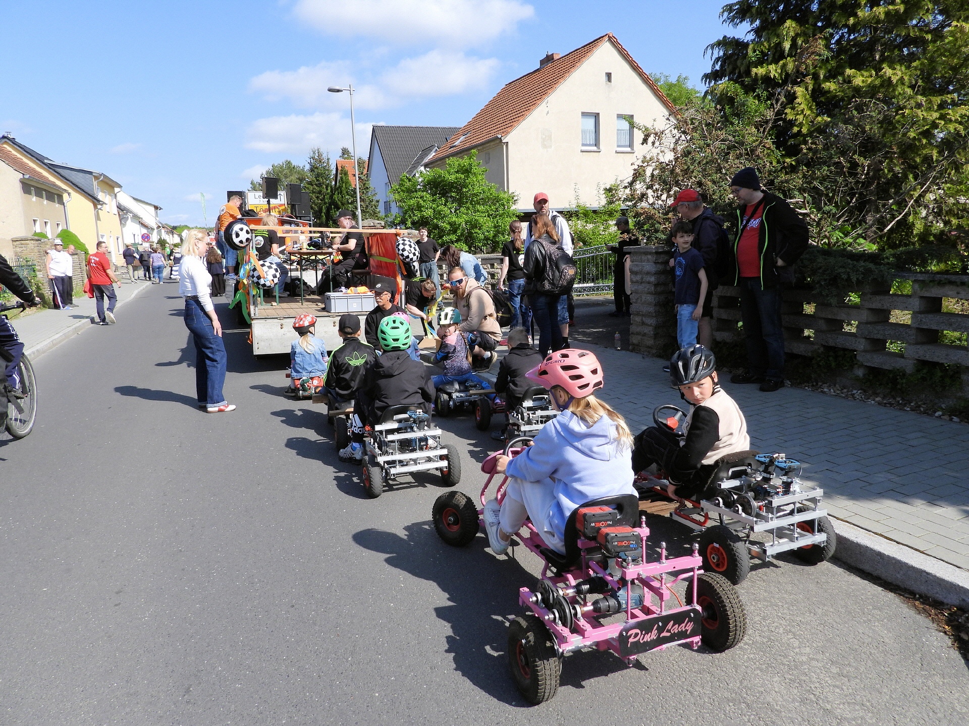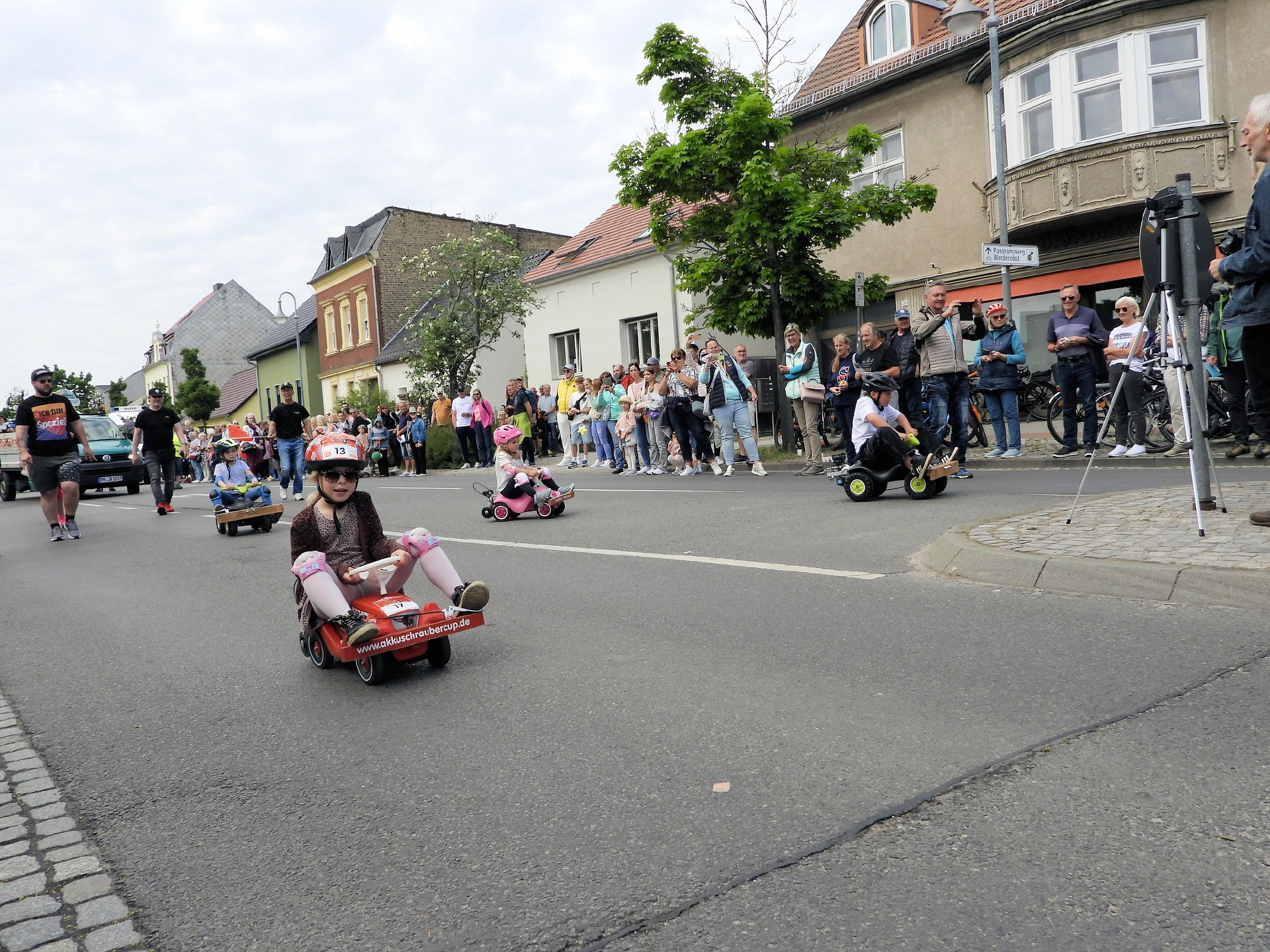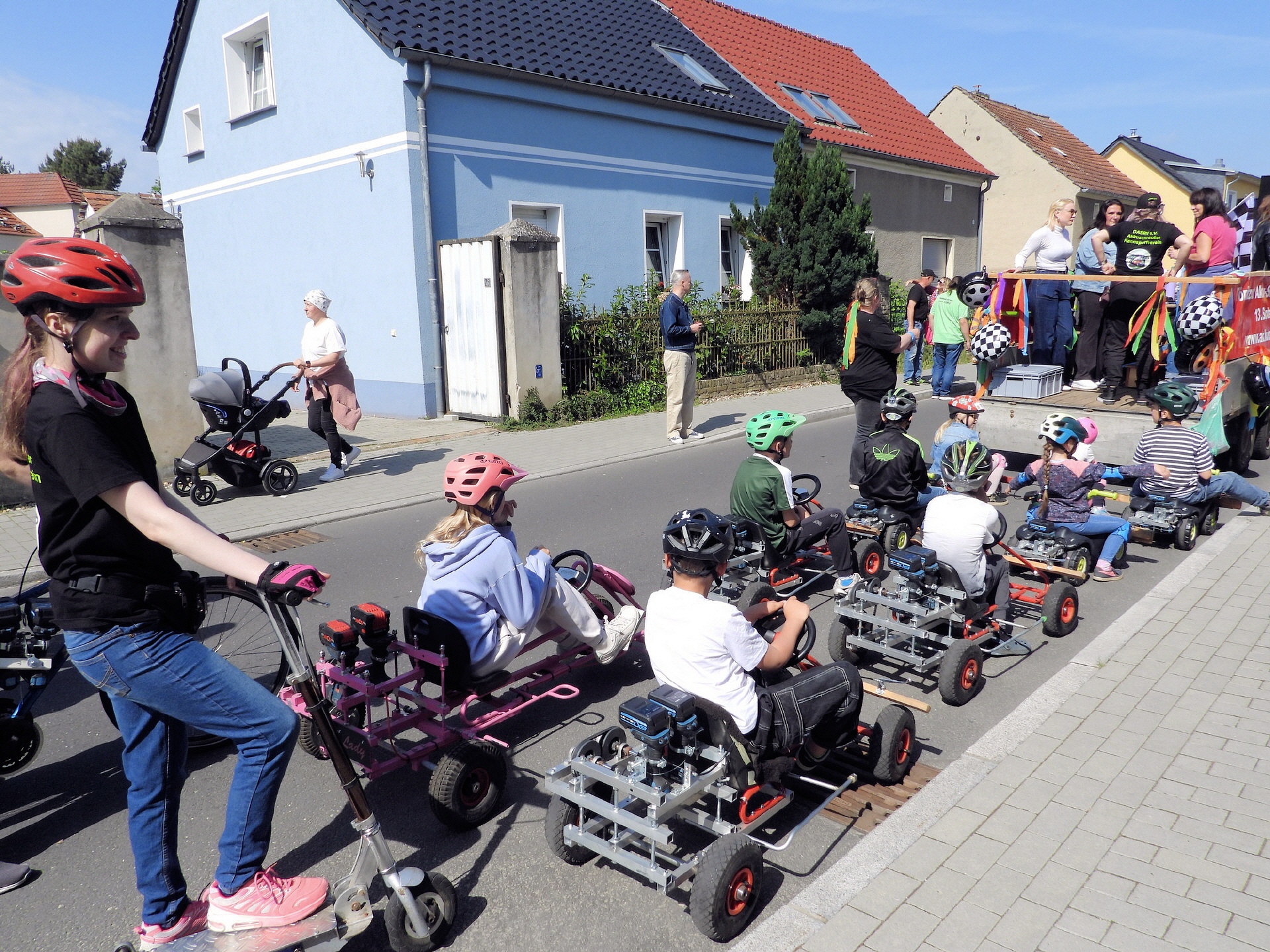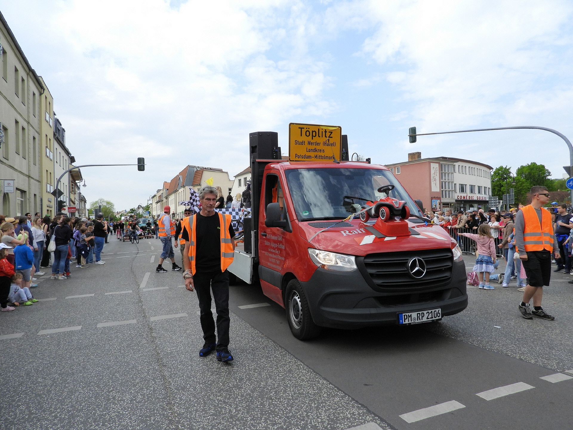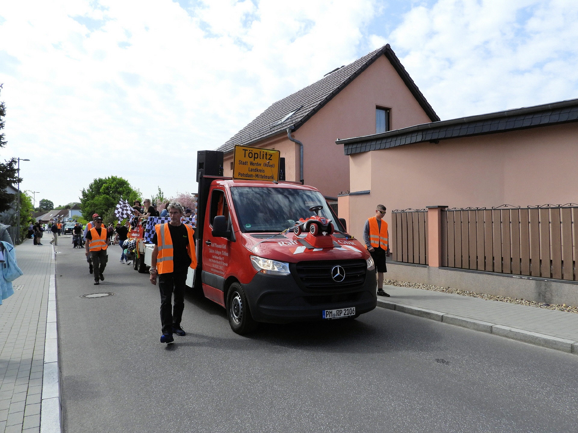Angeführt wurde der Tross durch den "Töplitzer Inselsoundbollerwagen" mit DJ Oli und die auf dem Anhänger jubelnde Fangemeinde. Als Schluss folgten die Fahrer mit ihren Akkuschrauber-Boliden, ein Spass nicht nur für die Rennfahrer selbst sondern auch für die Zuschauer.