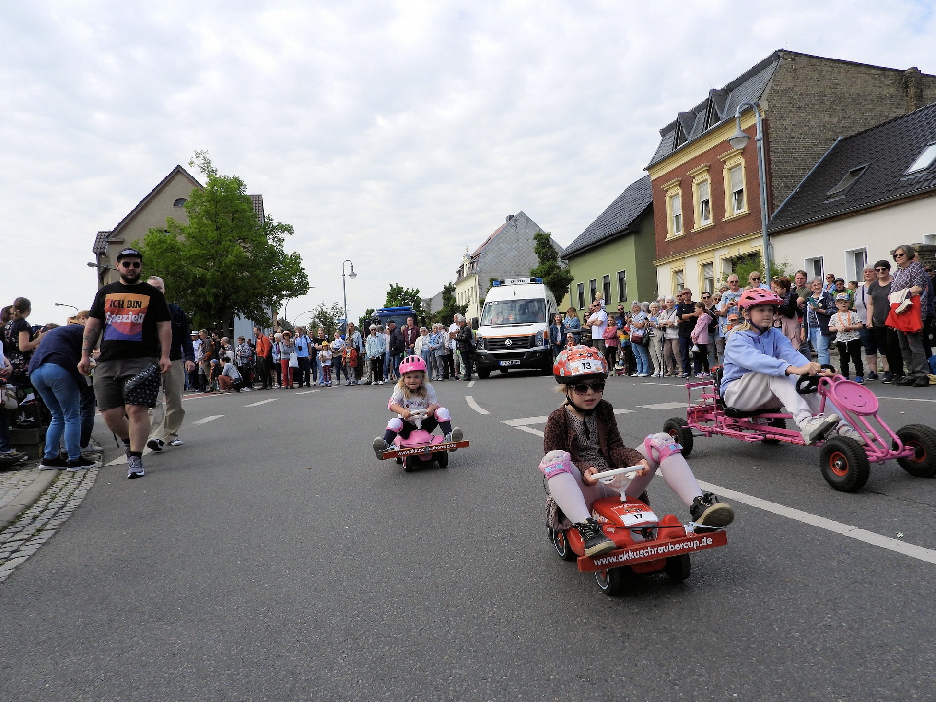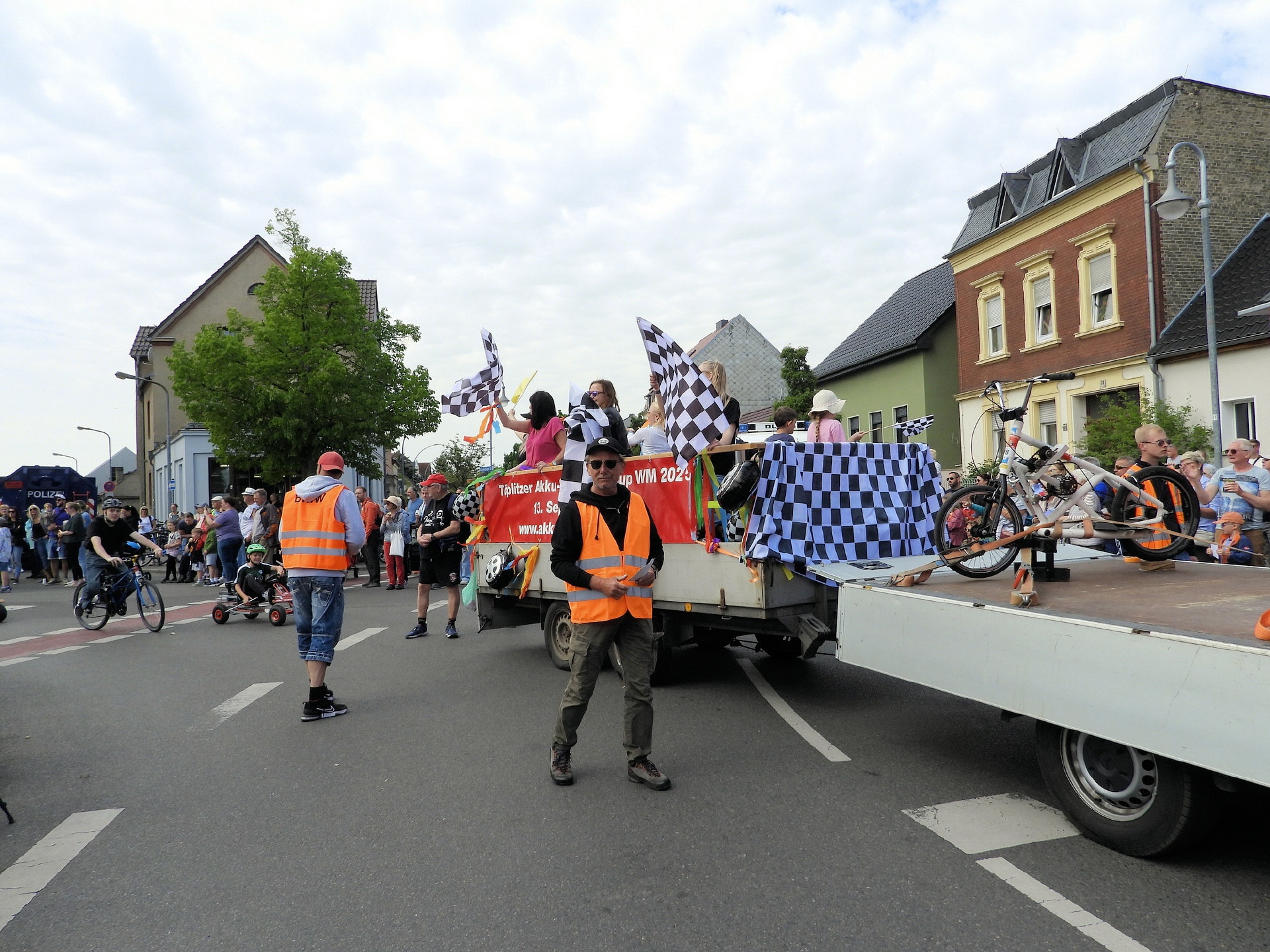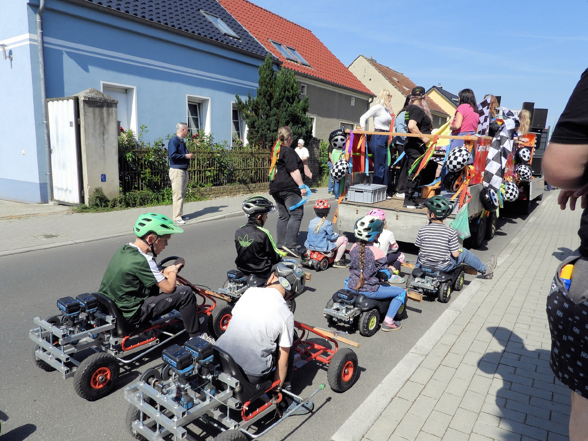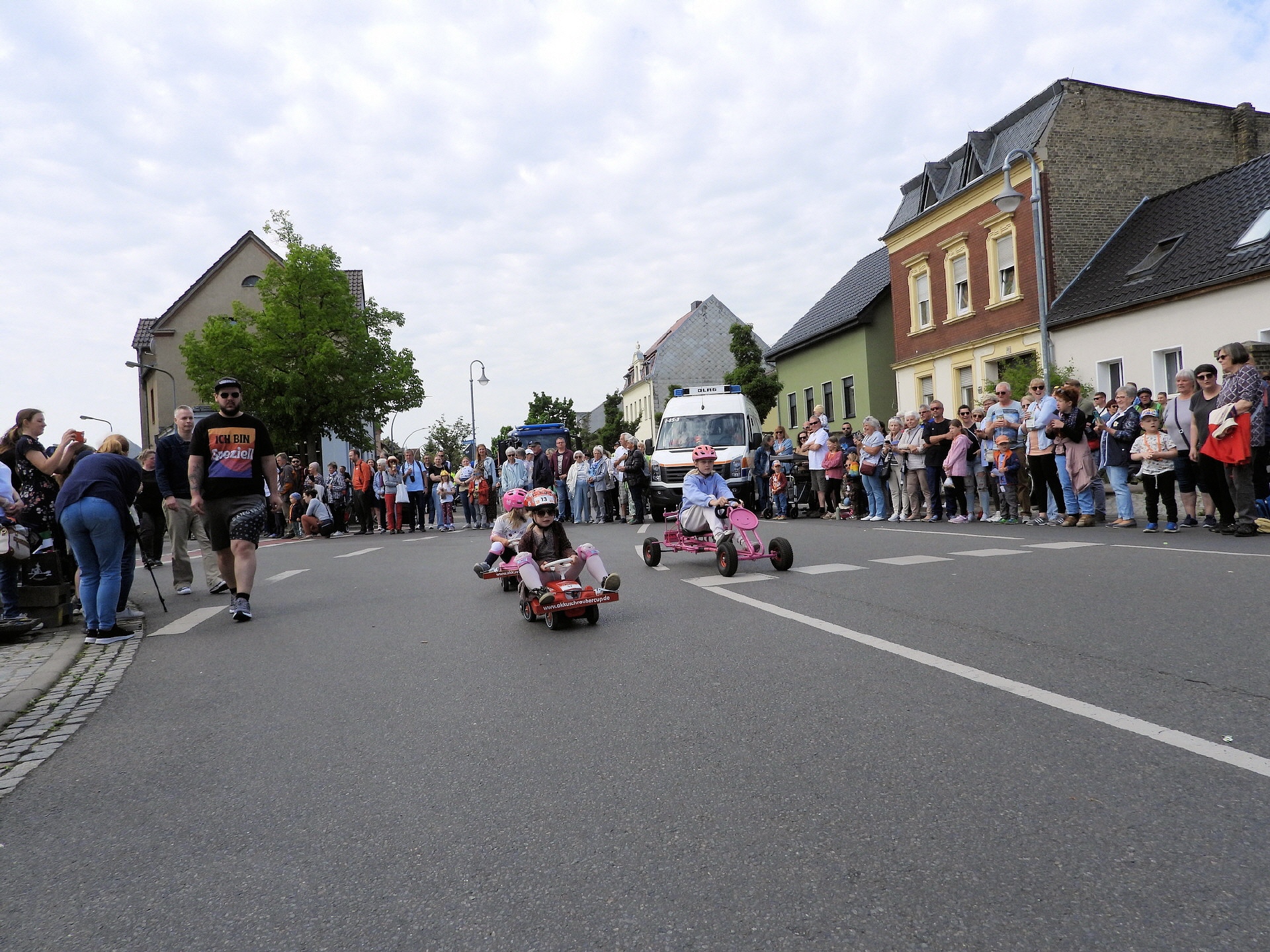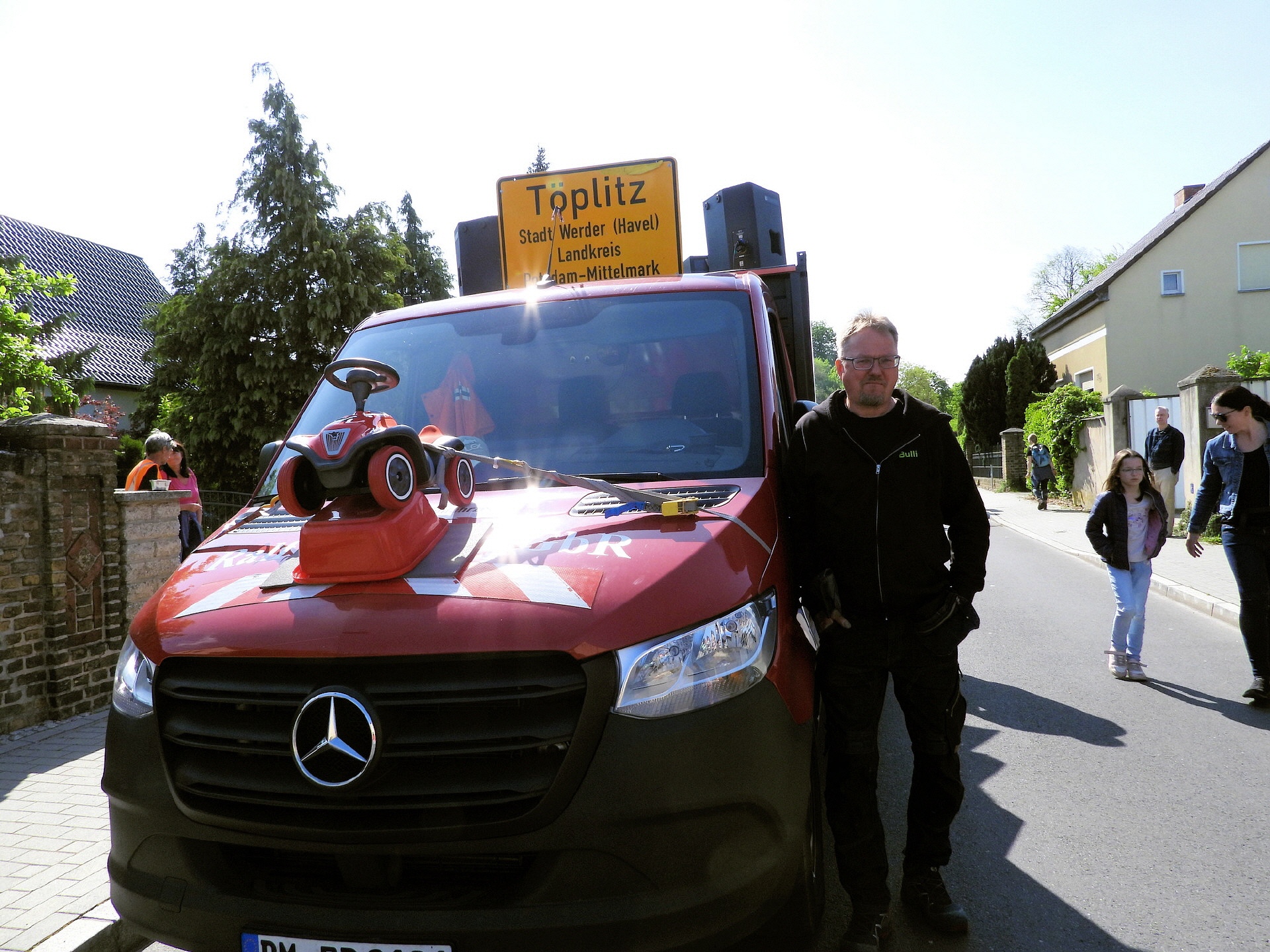 Angeführt wurde der Tross durch den "Töplitzer Inselsoundbollerwagen" mit DJ Oli und die auf dem Anhänger jubelnde Fangemeinde. Als Schluss folgten die Fahrer mit ihren Akkuschrauber-Boliden, ein Spass nicht nur für die Rennfahrer selbst sondern auch für die Zuschauer.