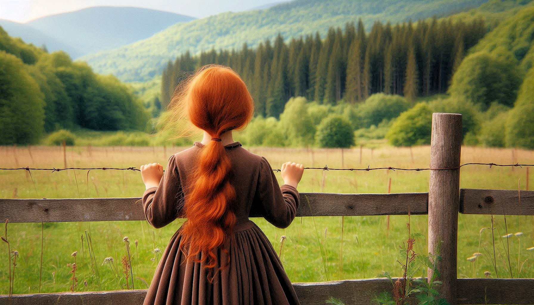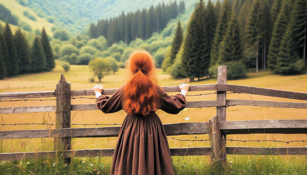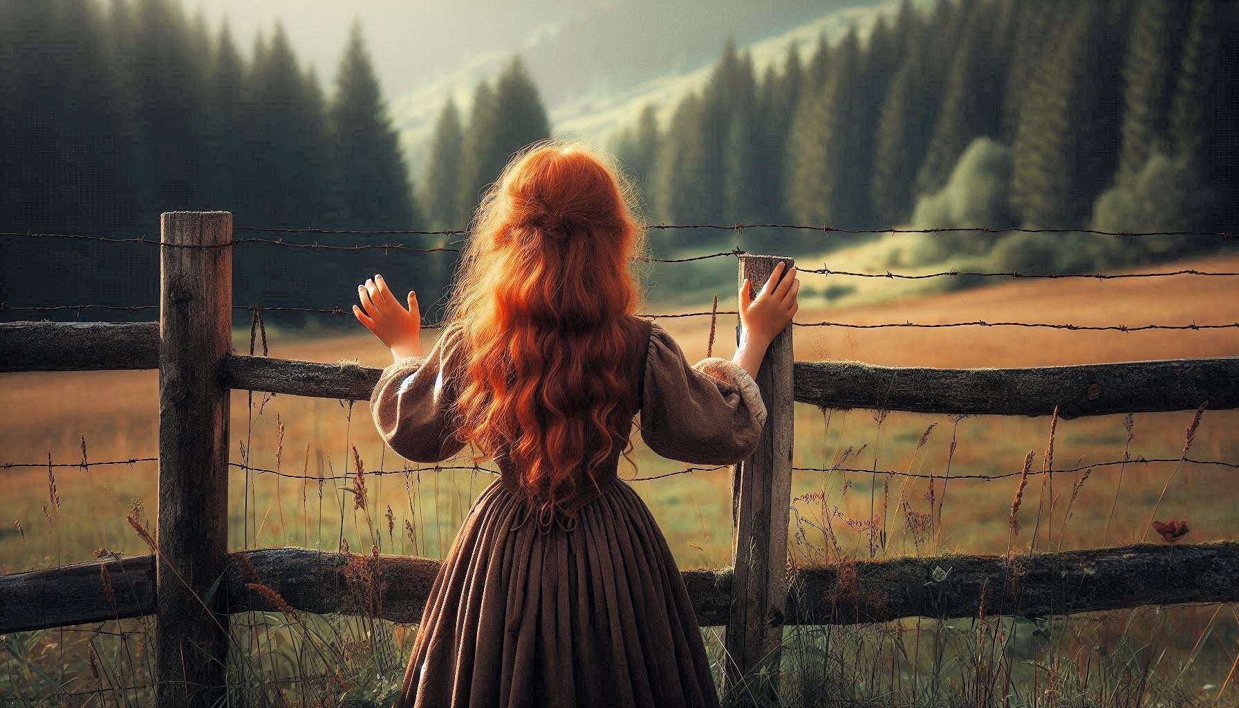 Grafik mit kleinem rothaarigem Mädchen am Weidezaun