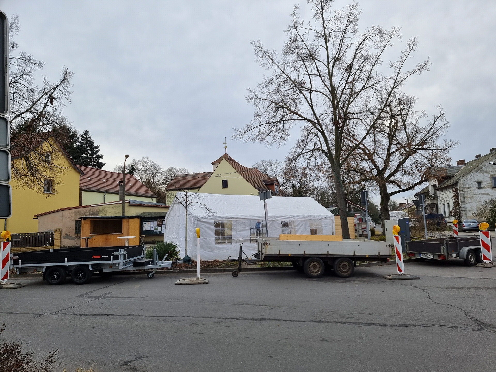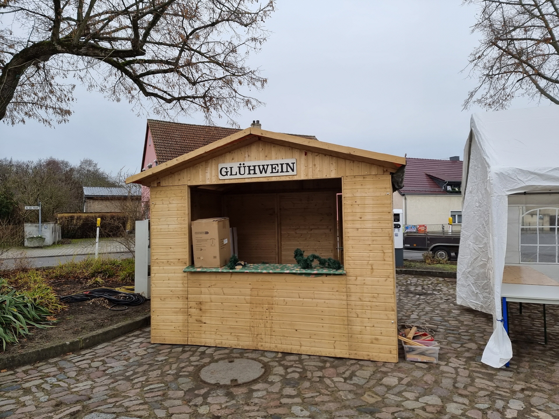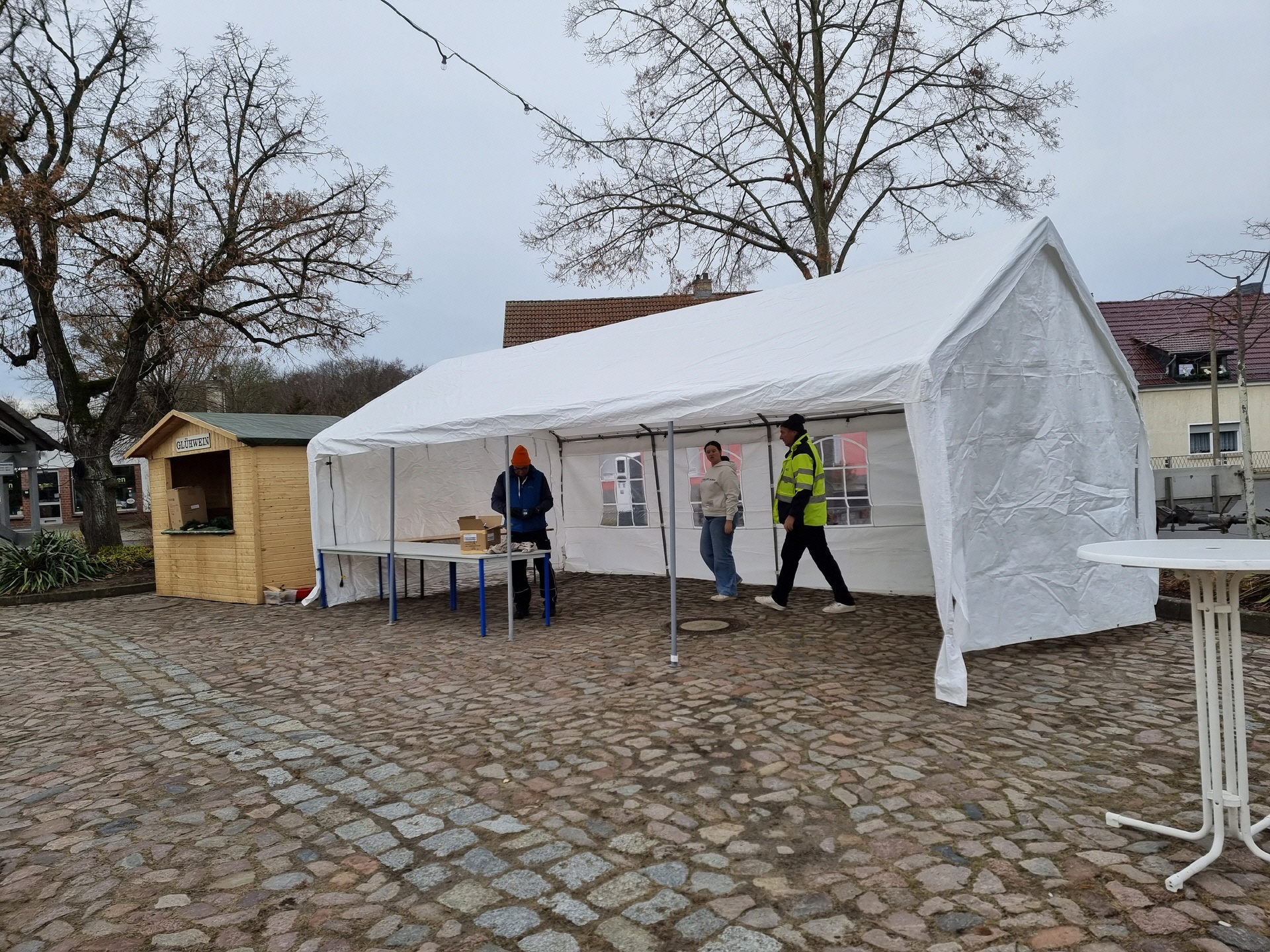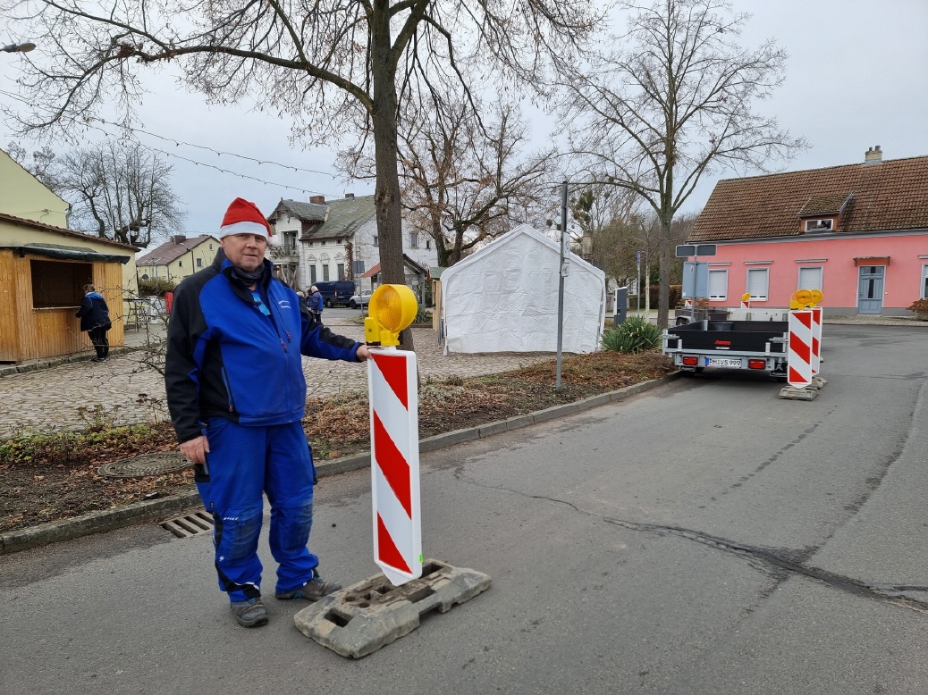 Schon in den Tagen davor waren viele fleißige Helfer am Werk, um die ersten Vorbereitungen zu treffen. Die Verkaufs- und Glühweinhäuschen wurden herbeigeschafft und auf dem Dorfplatz aufgebaut. Am Samstagmorgen um 9 Uhr ging es dann weiter. Die Zelte und Verkaufsstände wurden auf dem Dorfplatz und im Bürgerpark aufgestellt, die Elektroinstallation durchgeführt, und es wurde fleißig dekoriert. Im Laufe des Vormittags konnten die verschiedenen Anbieter und Macher ihre Stände einrichten. Der "Töplitzer Inselsoundbollerwagen" machte seinen Soundcheck, und gegen 14 Uhr war alles bereit.