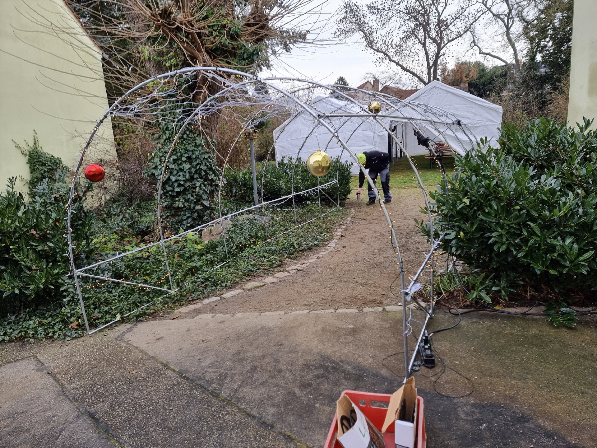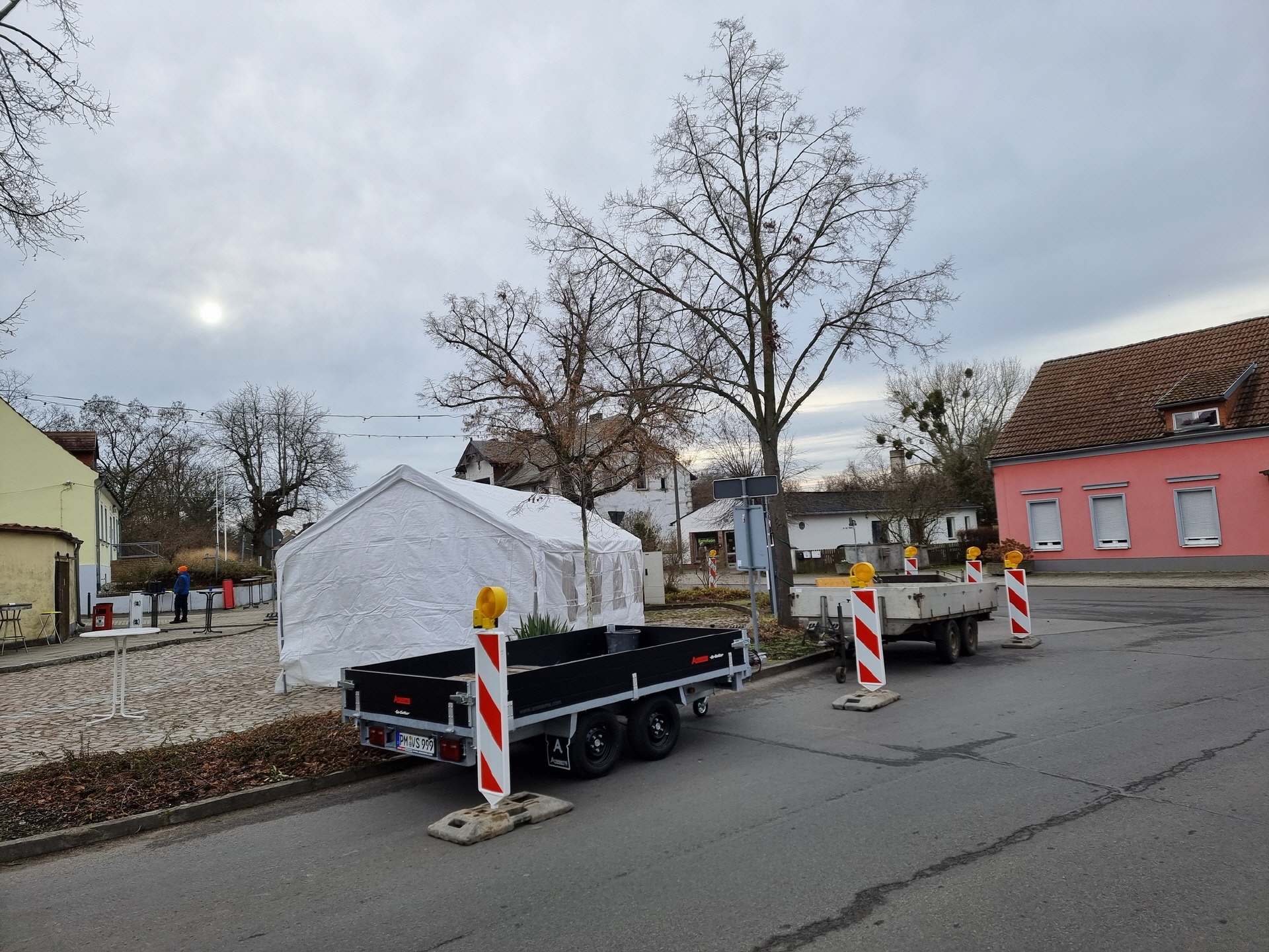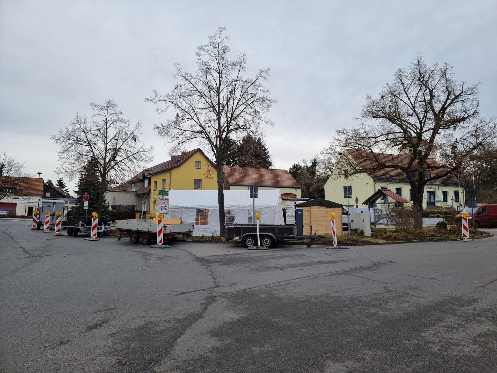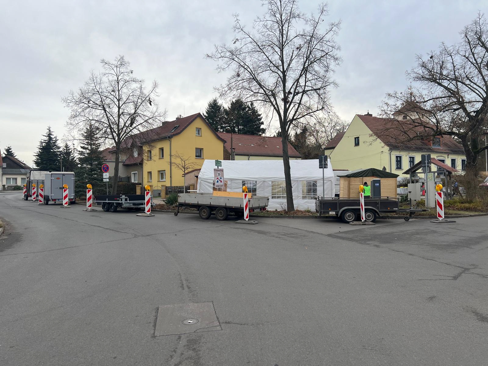 Schon in den Tagen davor waren viele fleißige Helfer am Werk, um die ersten Vorbereitungen zu treffen. Die Verkaufs- und Glühweinhäuschen wurden herbeigeschafft und auf dem Dorfplatz aufgebaut. Am Samstagmorgen um 9 Uhr ging es dann weiter. Die Zelte und Verkaufsstände wurden auf dem Dorfplatz und im Bürgerpark aufgestellt, die Elektroinstallation durchgeführt, und es wurde fleißig dekoriert. Im Laufe des Vormittags konnten die verschiedenen Anbieter und Macher ihre Stände einrichten. Der "Töplitzer Inselsoundbollerwagen" machte seinen Soundcheck, und gegen 14 Uhr war alles bereit.