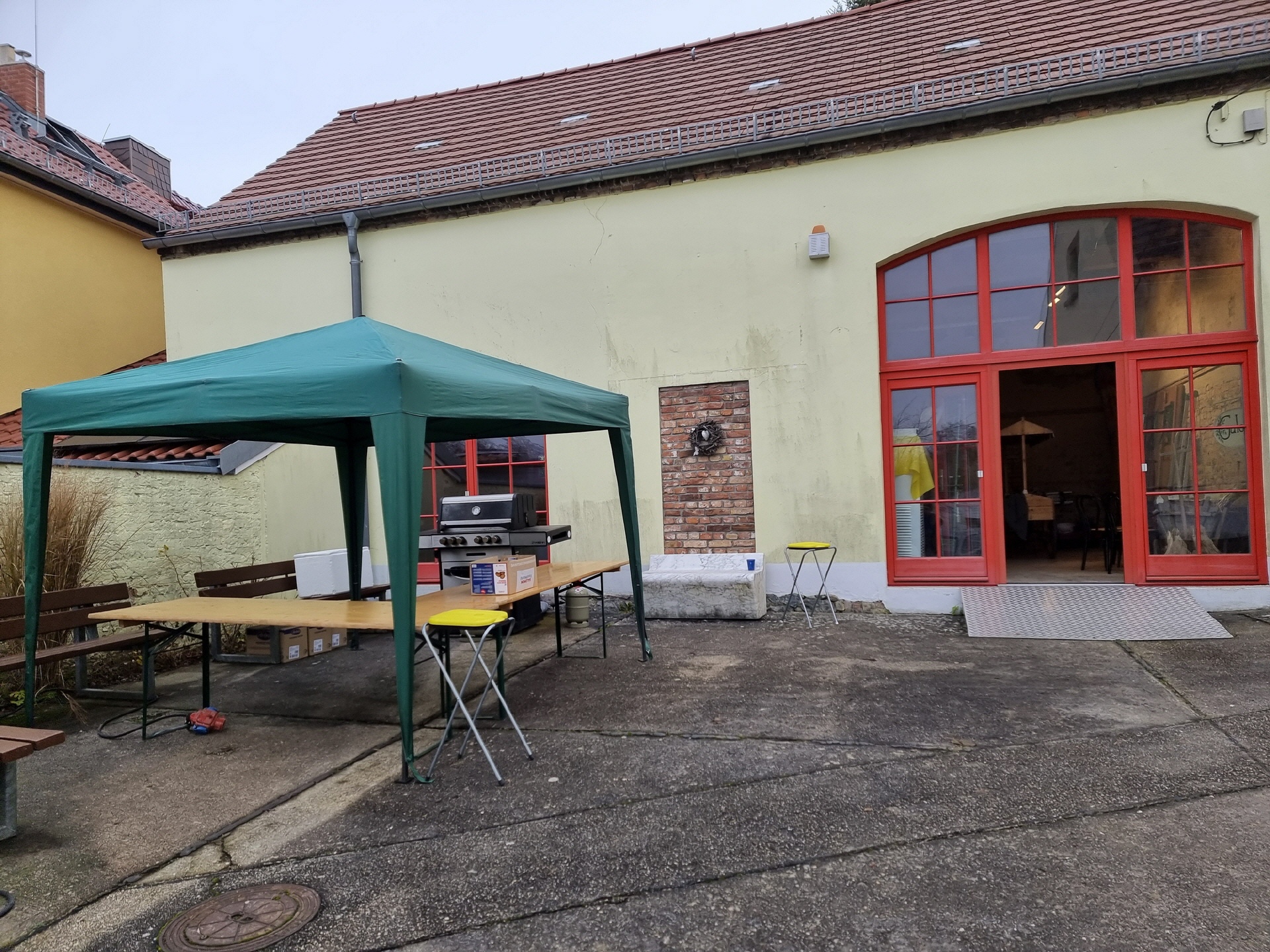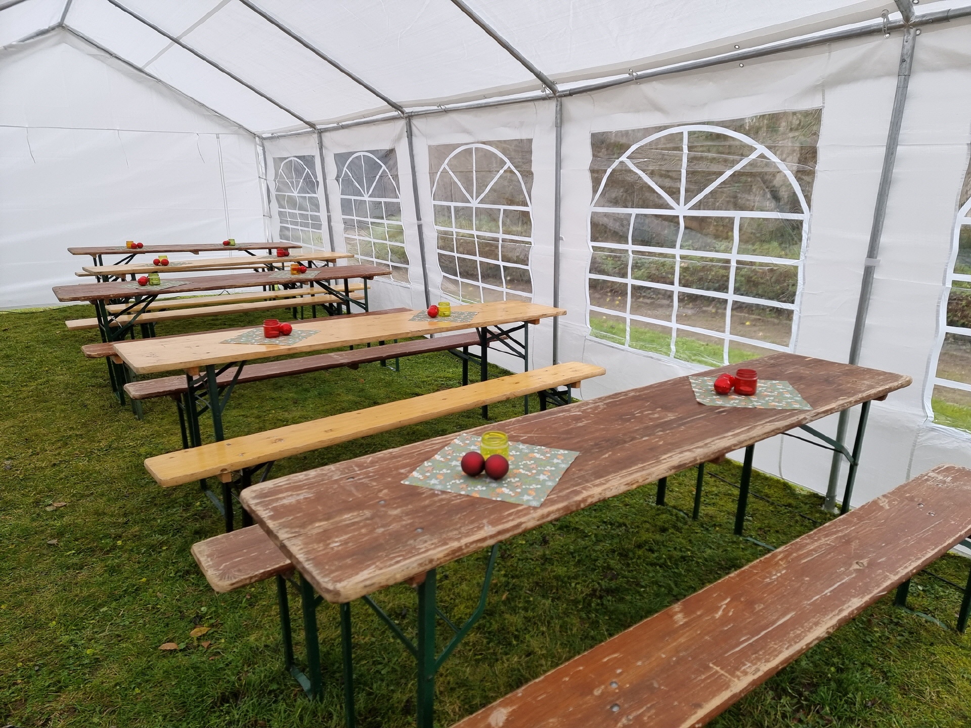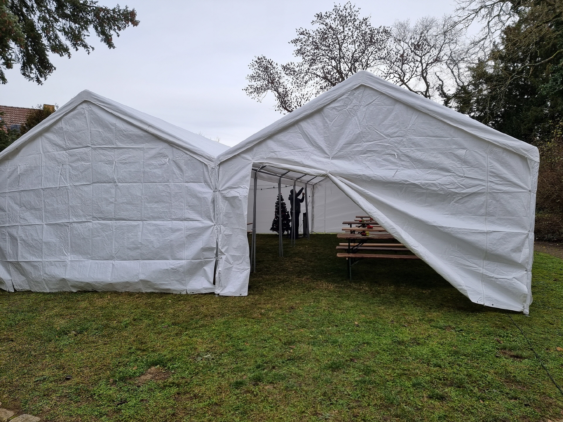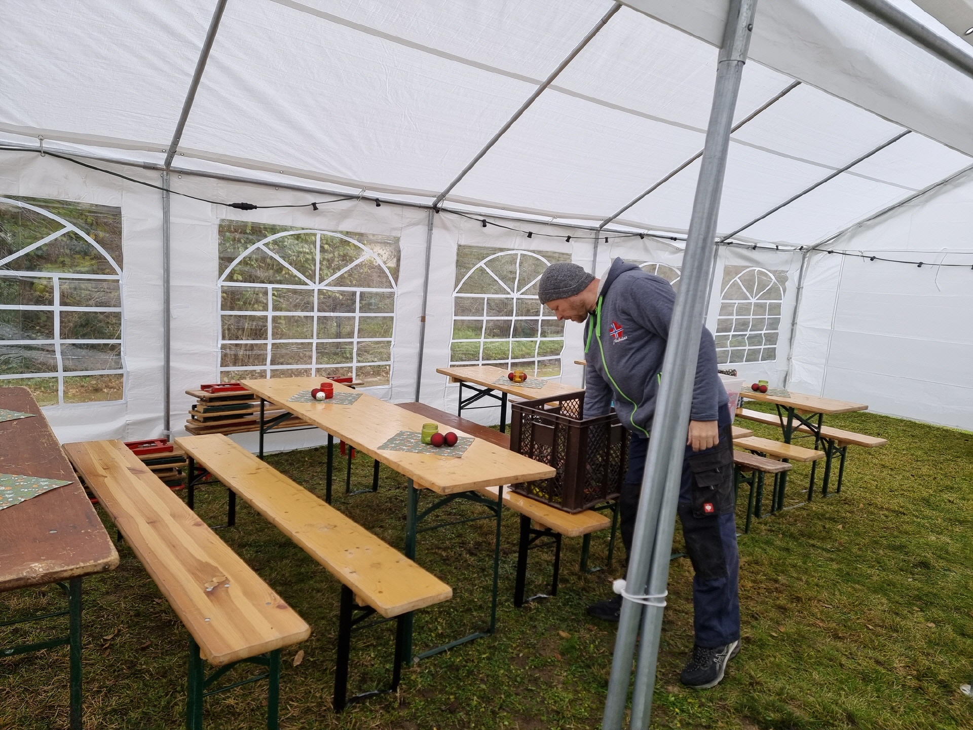 Schon in den Tagen davor waren viele fleißige Helfer am Werk, um die ersten Vorbereitungen zu treffen. Die Verkaufs- und Glühweinhäuschen wurden herbeigeschafft und auf dem Dorfplatz aufgebaut. Am Samstagmorgen um 9 Uhr ging es dann weiter. Die Zelte und Verkaufsstände wurden auf dem Dorfplatz und im Bürgerpark aufgestellt, die Elektroinstallation durchgeführt, und es wurde fleißig dekoriert. Im Laufe des Vormittags konnten die verschiedenen Anbieter und Macher ihre Stände einrichten. Der "Töplitzer Inselsoundbollerwagen" machte seinen Soundcheck, und gegen 14 Uhr war alles bereit.