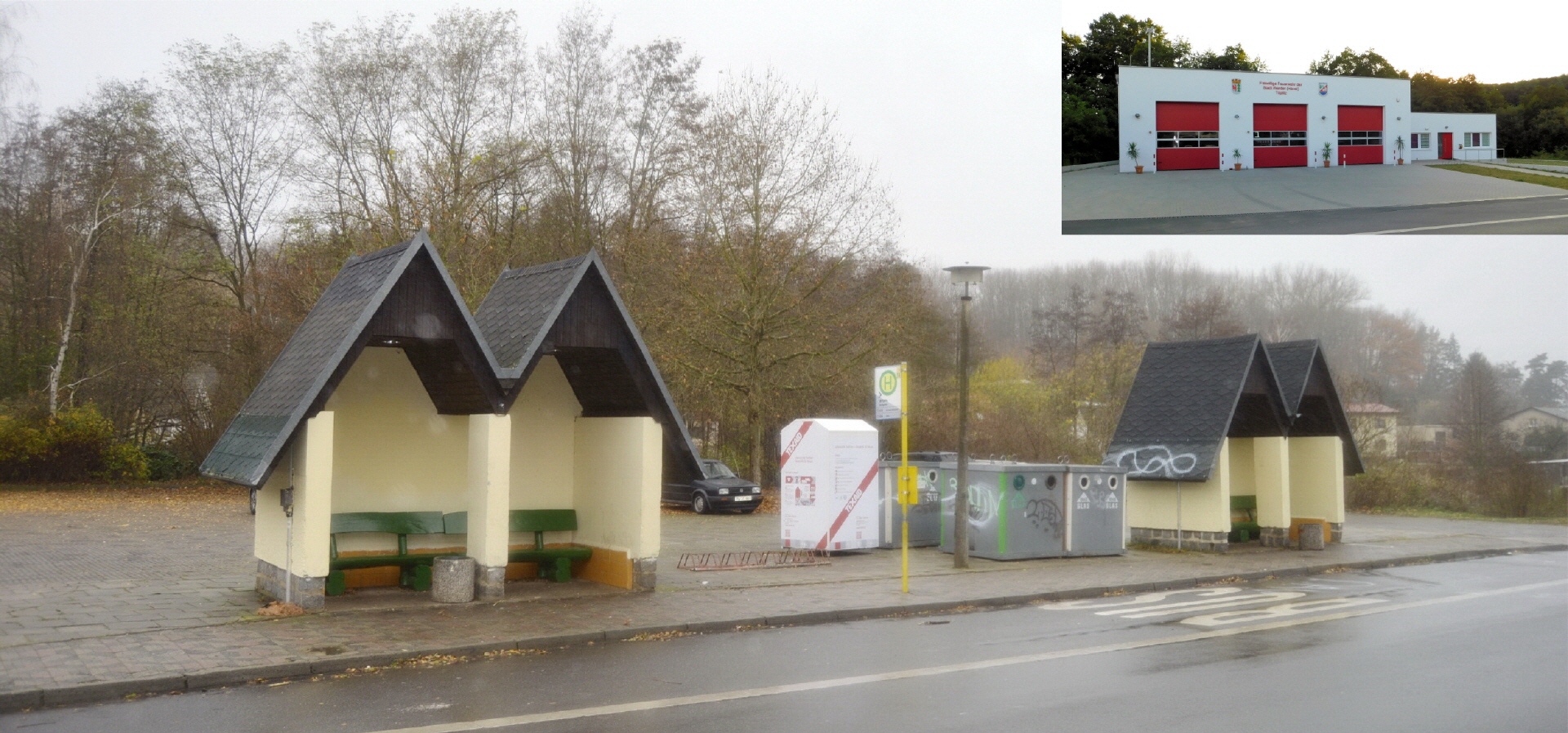 2015 - Hier nocheinmal ein altes Bilder vom Parkplatz mit Bushaltestelle im Ortszentrum, neben dem Hotel Mohr. Der Parkplatz fiel dann weg, dafür kam das neue Gerätehaus der FF Töplitz dort hin. Die Bushaltestelle blieb, wurde aber modernisiert etwas weiter rechts neben diesem Neubau der Feuerwehr platziert.