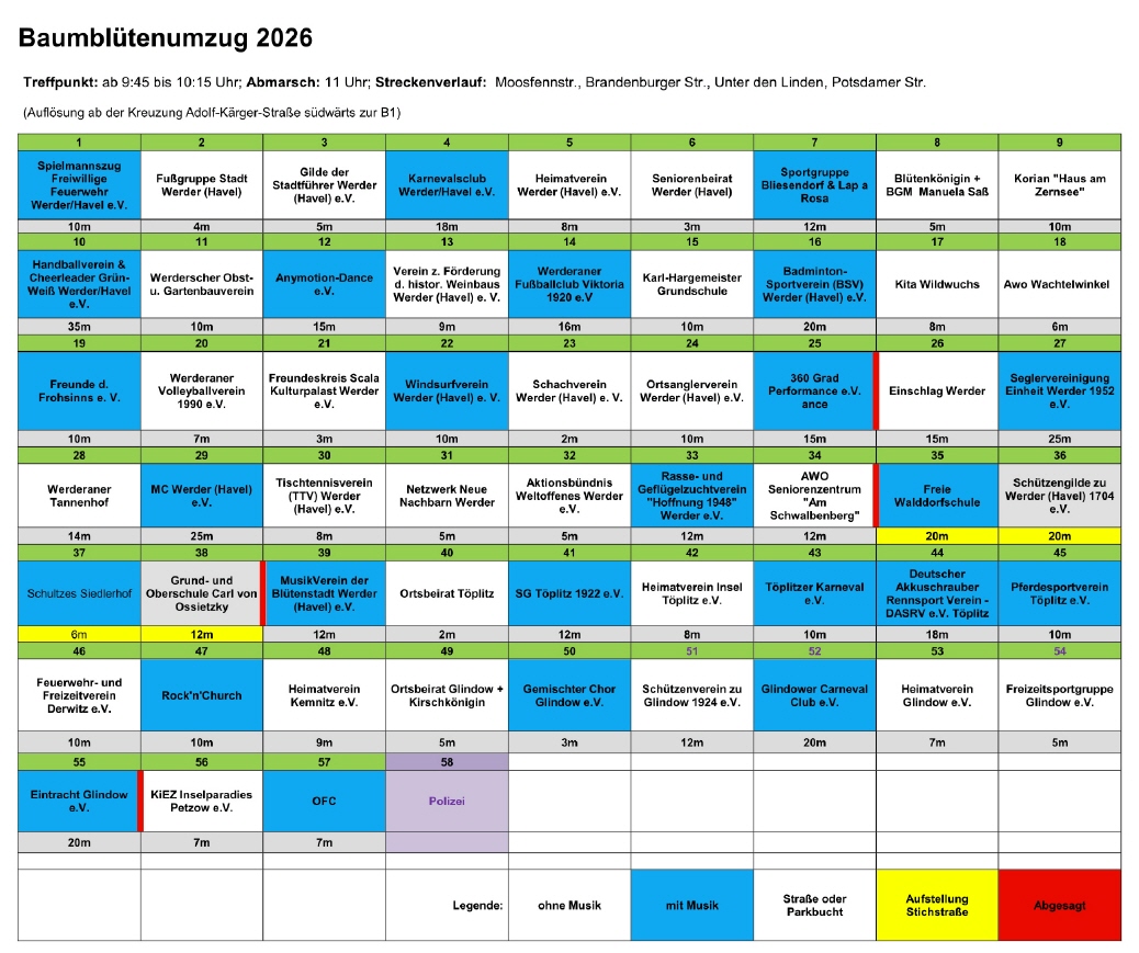 Es wird wieder einen Bustransfer mit einem Bus ab dem Dorfplatz geben. Die Abfahrt ist um 09.30 Uhr vorgesehen, sodass um 11.00 Uhr der Umzug ab Moosfennstraße beginnen kann. Für die Rückfahrt sind wir noch im Gespräch mit dem Organisationsteam, wo wir in Werder abfahren können (vermutlich Brandenburger Straße), da der Festbereich großräumig für den Fahrzeugverkehr gesperrt ist.
