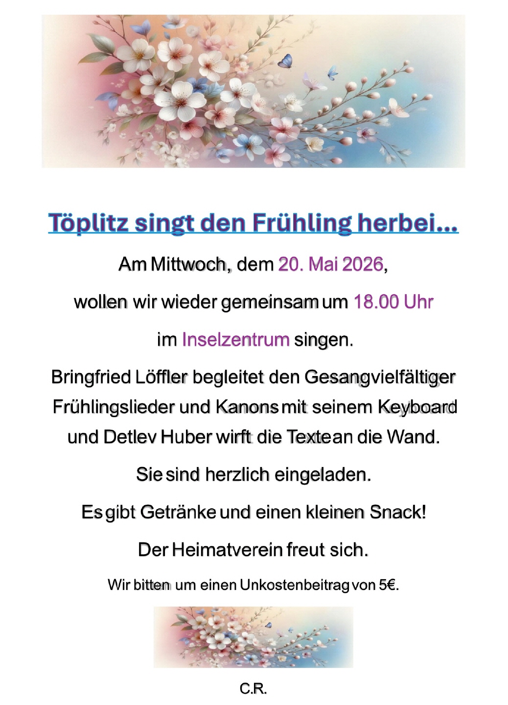 der Töplitzer Ortsbeirat ruft wieder alle Vereine auf, sich am Baumblütenumzug am Sonnabend, dem 02.05.2026, zu beteiligen.