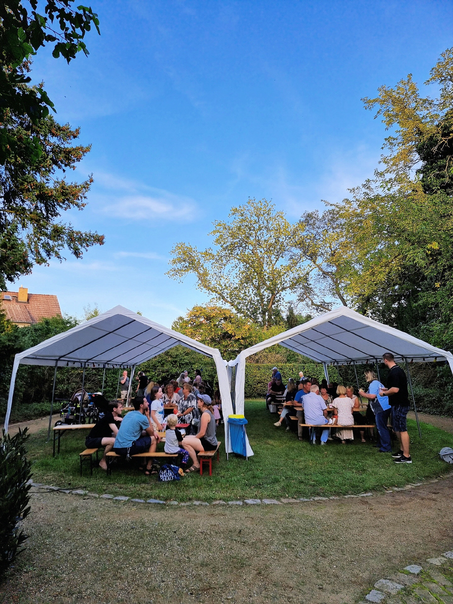 Das Winzerfest fiel in diesem Jahr etwas kleiner aus. Da auch der Töplitzer Heimatverein mit deutlich weniger tatkräftiger Unterstützung auskommen musste, beschränkte sich die Festlichkeit auf die Fläche der Galerie und die Wiese hinter dem Bürgerhaus. Dort gab es Zelte mit vielen Sitzgelegenheiten. Der Parkplatz blieb frei.