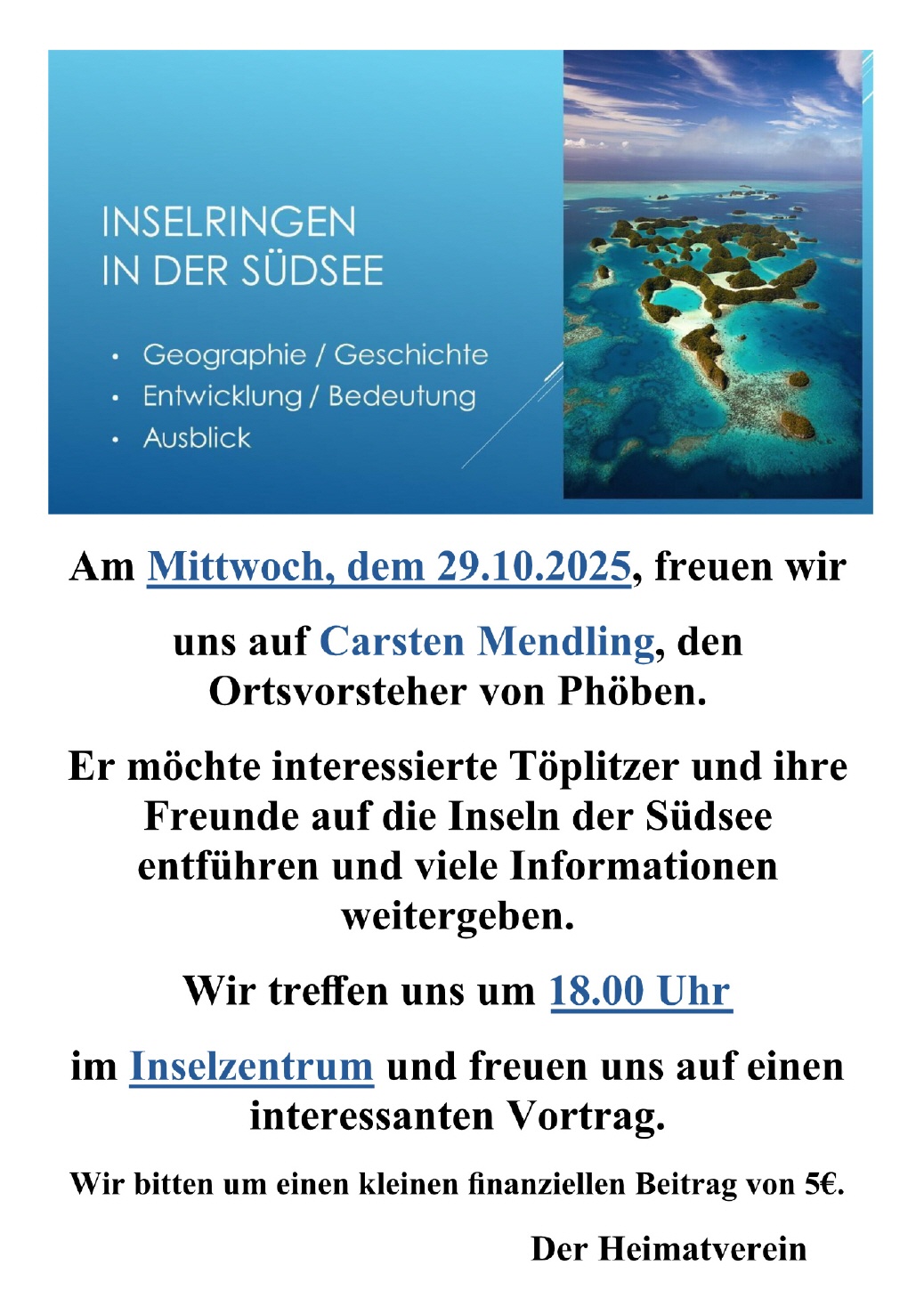 - 29.10.2025 Inselringen im Südpazifik (Vortrag), 18 Uhr, Inselzentrum