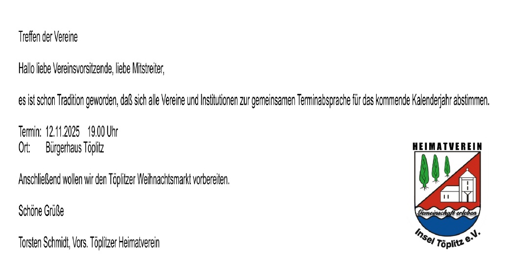 12.11.2025: Treffen der Vereine, Inselzentrum, 19 Uhr [mehr]