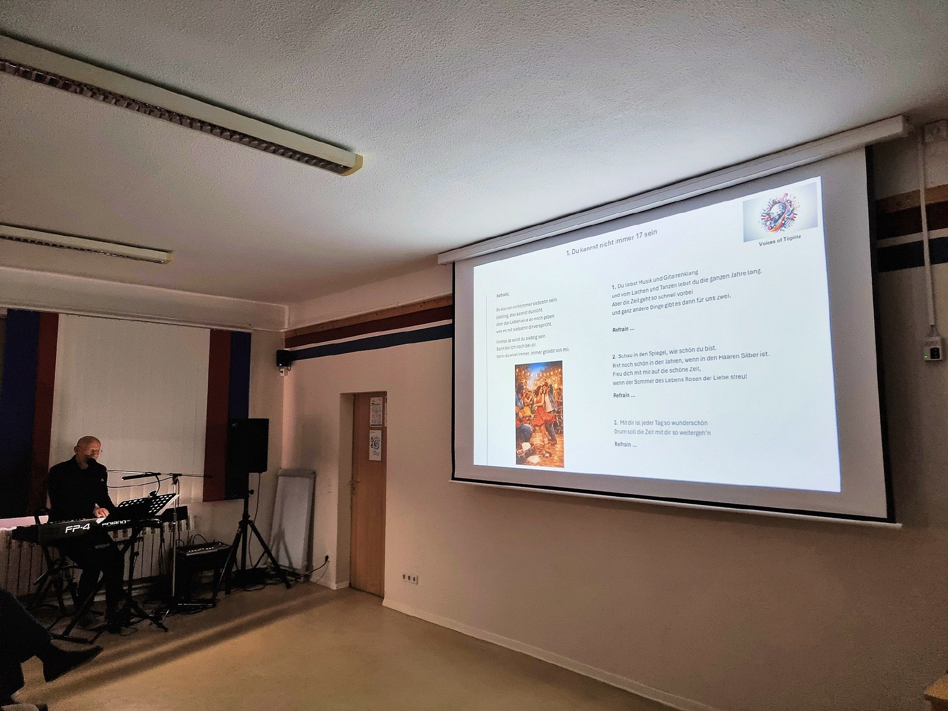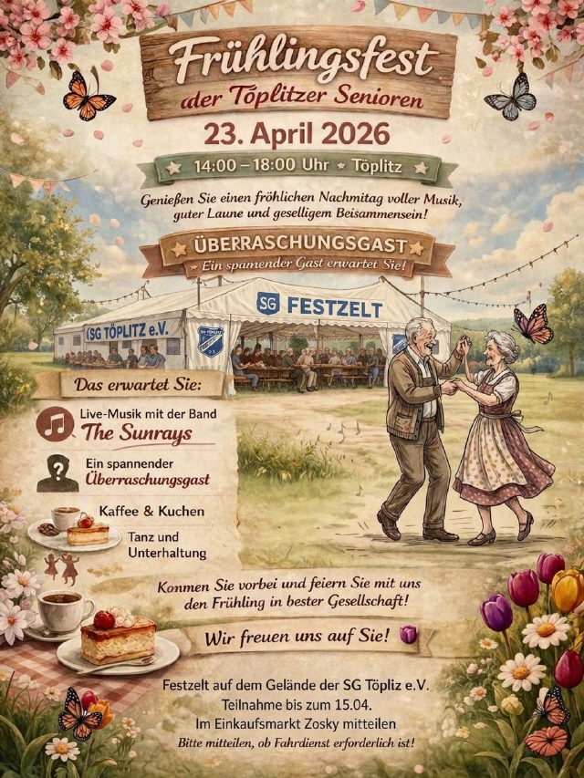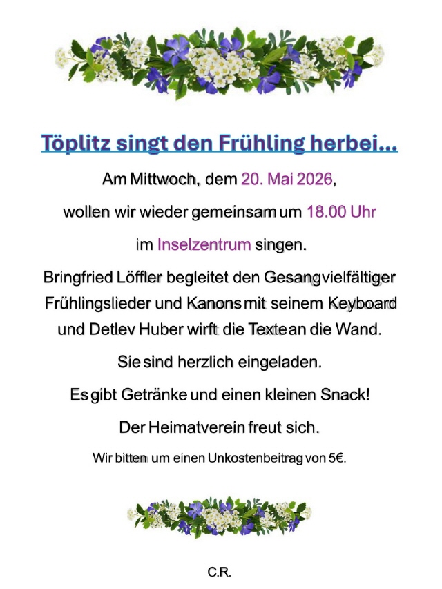 Am 18. März 2026 fand im Inselzentrum ein von der Töplitz-Akademie organisierter Schlagerabend statt. Die Gäste, nicht nur aus Töplitz, sangen Schlager aus der Vergangenheit, begleitet von dem Musiker Bringfried Löffler auf seinem Keyboard. Die Texte der Lieder wurden mithilfe eines Beamers auf eine Leinwand projiziert, sodass alle mitsingen konnten. Zahlreiche Gäste waren anwesend. Für das leibliche Wohl war mit diversen Getränken, selbstgemachten Schmalzstullen und weiteren Leckereien gesorgt. Alles in allem war es ein gelungener Abend, der allen Beteiligten viel Spaß gemacht hat. Bis bald, sicherlich beim nächsten Schlagersingen im Inselzentrum!
