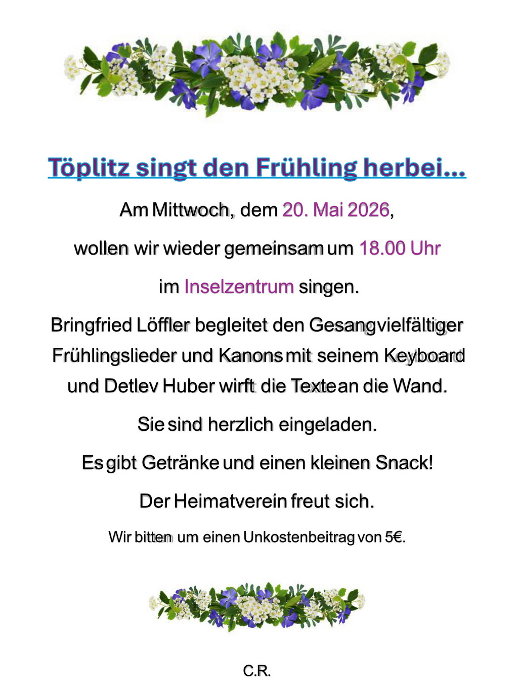 Der Heimatverein Töplitz lud zu einer musikalischen Reise ein. Die Gruppe "Manifest" gab am 17. April 2026 ein kleines Konzert im Inselzentrum. Es wurden Jiddische Lieder und Tänze unter dem Titel "Mit Tränen aber kann man keine Tränen stillen" präsentiert. Die Lieder erzählen vom Familienleben der Juden und sind sowohl lustig als auch erfrischend. Es wurden traditionelle und politische Lieder dargeboten. Ein wunderschöner Abend mit zahlreichen Gästen.